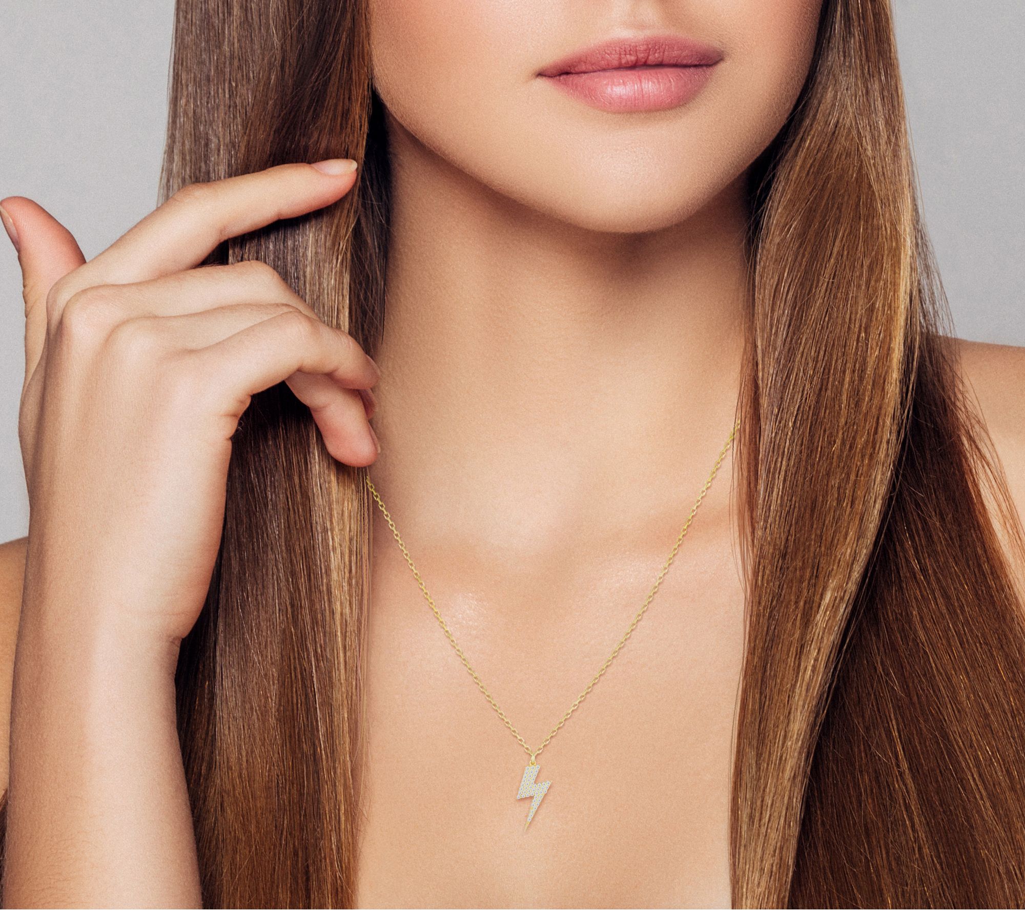 • Celestial motif; lighting bolt pendant with round, pave-set cubic zirconia; polished