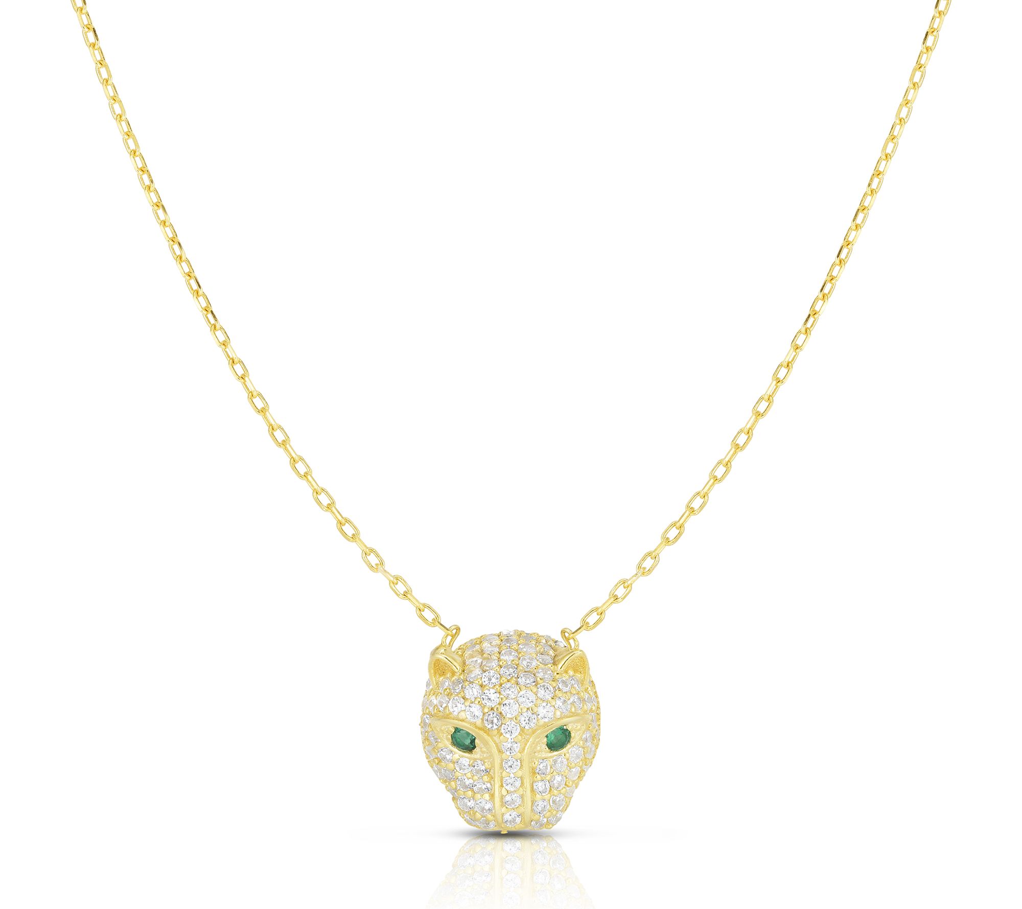 • Features a pave-set panther head pendant with round simulated cubic zirconia stones; rolo chain; polished finish