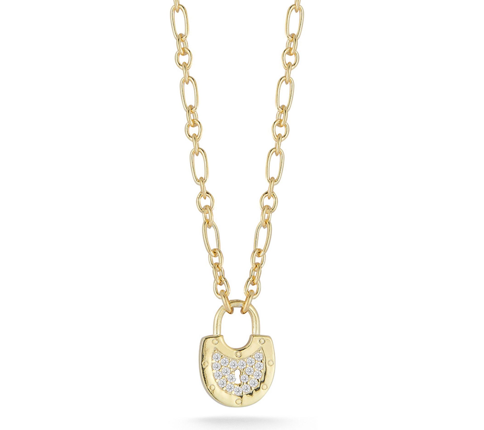 With its pave padlock pendant and rolo chain, this necklace is a great addition to your jewelry collection. Choose between 14K yellow gold-plated sterling silver or rhodium-plated sterling silver to match your style. Perfect for any occasion, it brings a touch of elegance to your outfit. From Sterlina Silver.