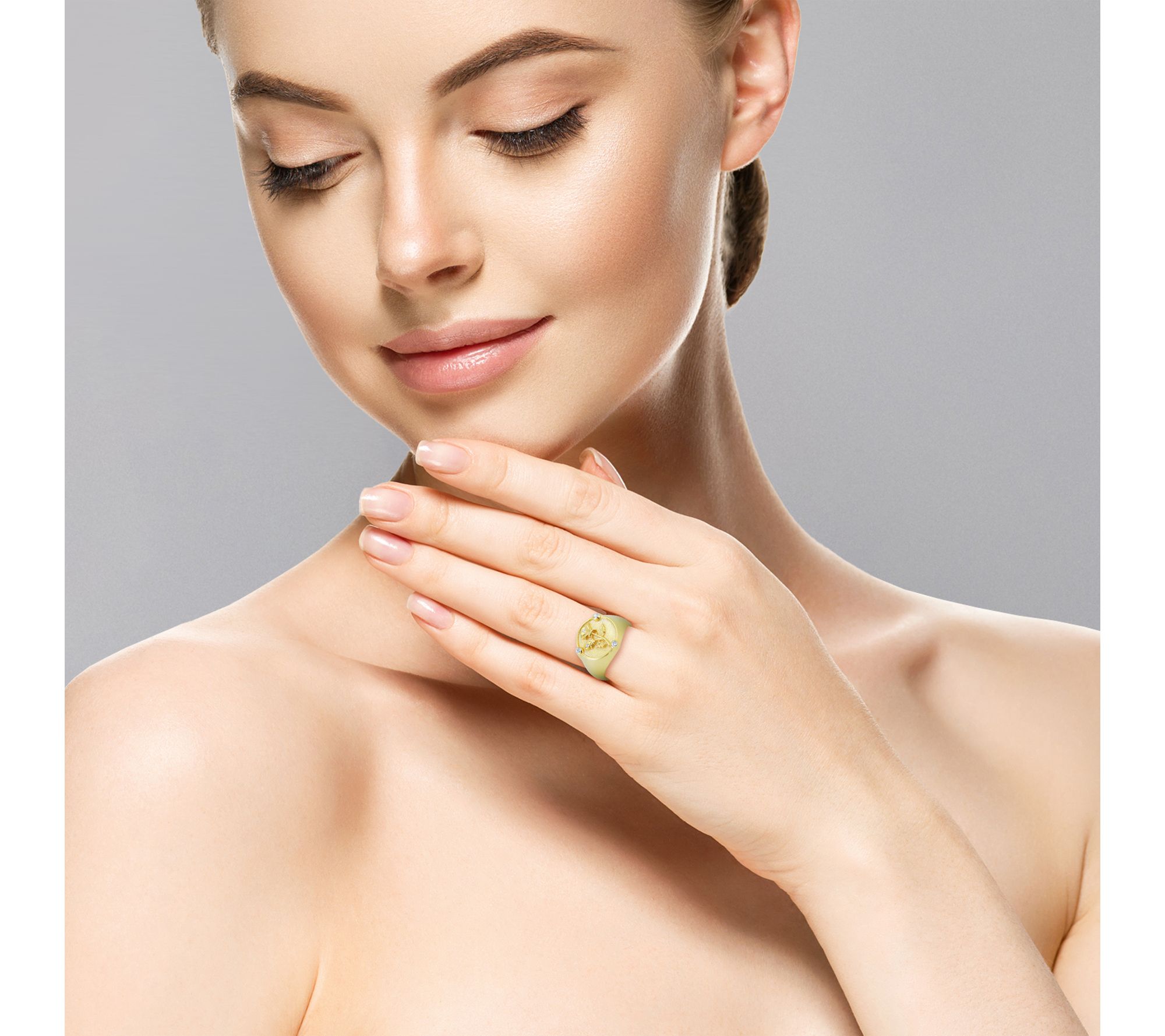 • Signet ring with rose design at center; accented with cubic zirconia stones; bezel set; polished finish