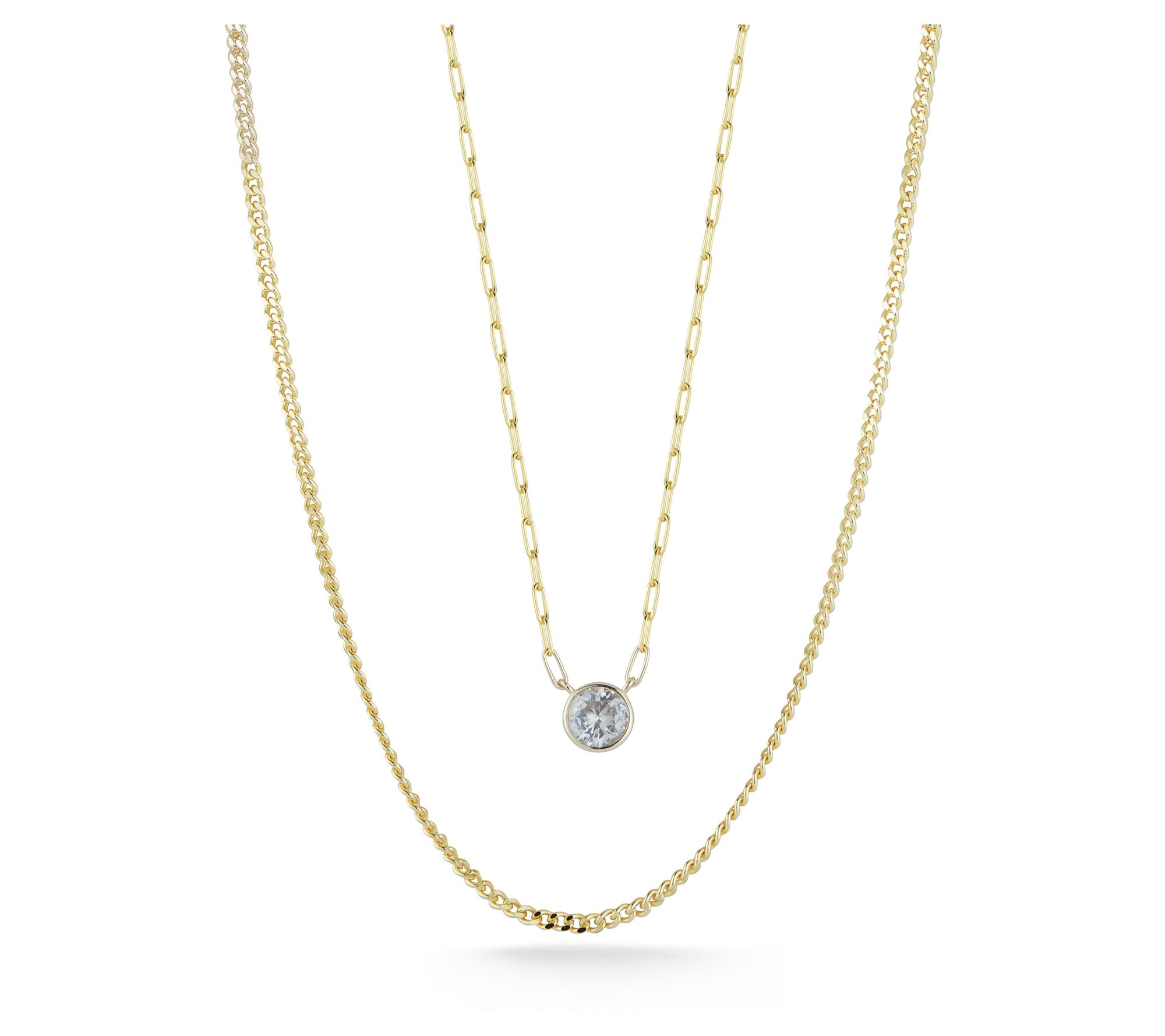 • Double layered design; dainty curb chain; paperclip chain; round-cut cubic zirconia pendant; bezel set