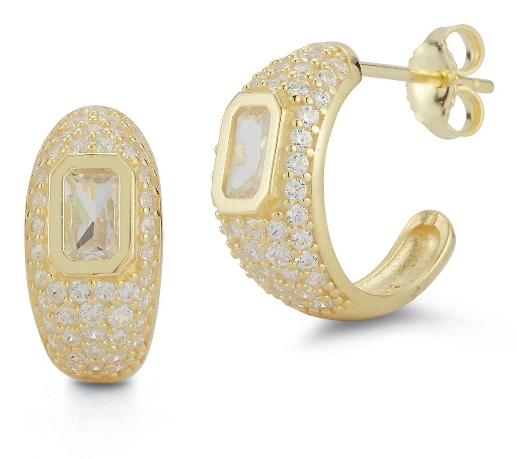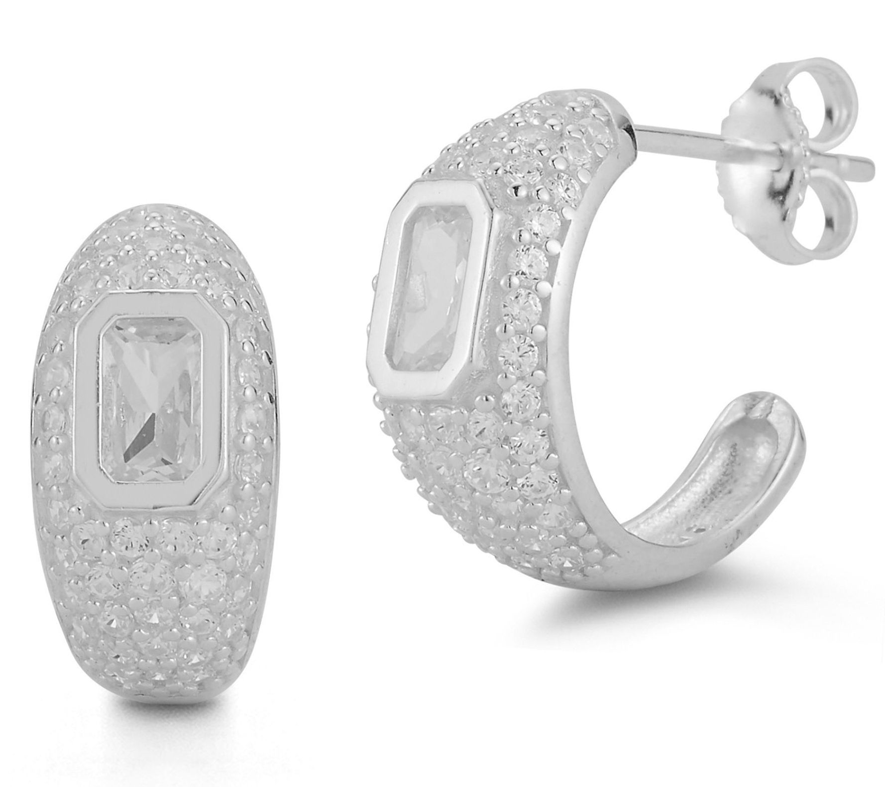 • Pave-set hoop design with single, emerald-cut cubic zirconia