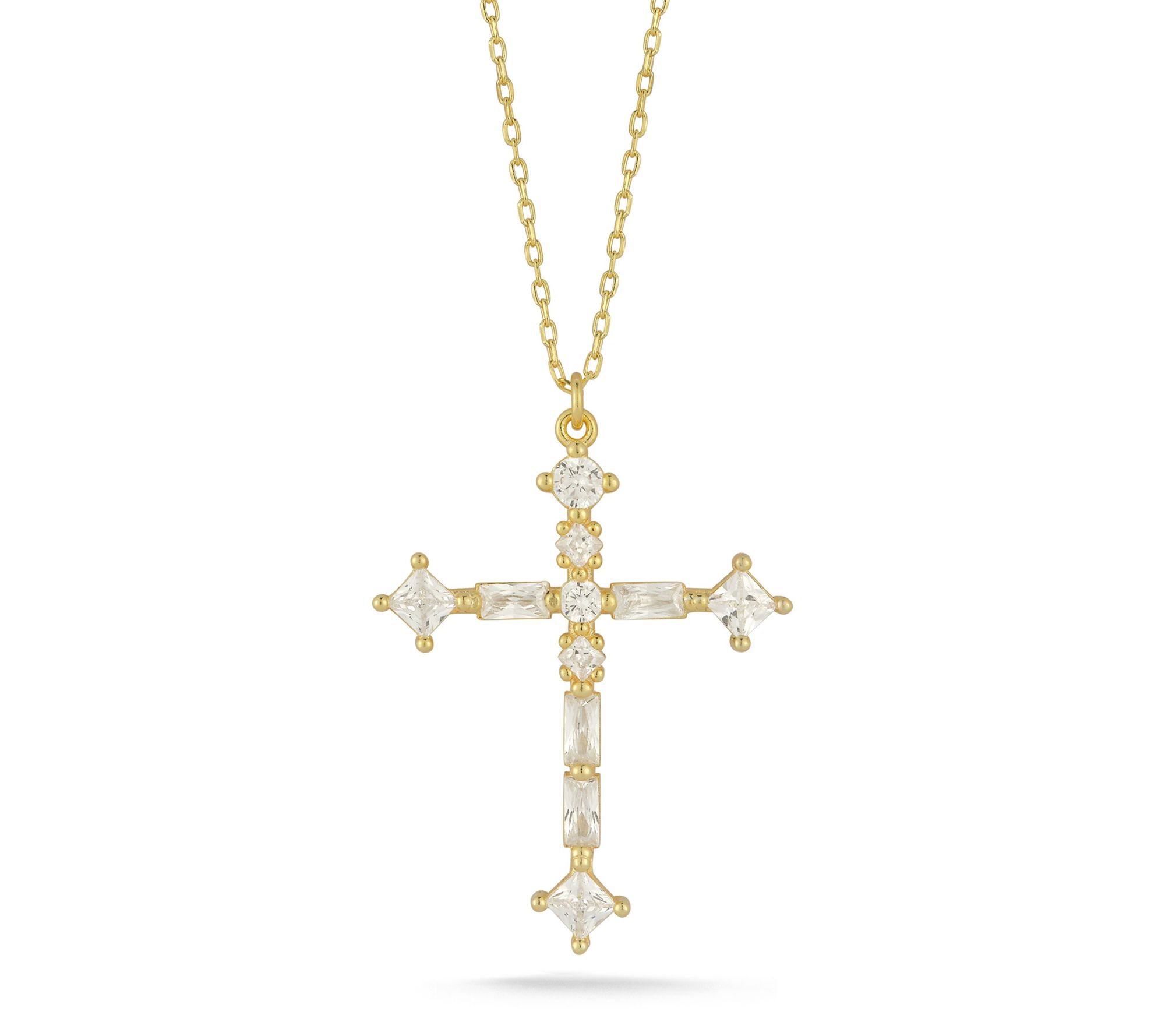 Shimmer with grace in this stunning cross pendant necklace, featuring a blend of baguette, princess, and round-cut cubic zirconia stones. Whether you choose 14K yellow gold-plated sterling silver or rhodium-plated sterling silver, this piece will add an elegant touch to your look. From Sterlina Silver.