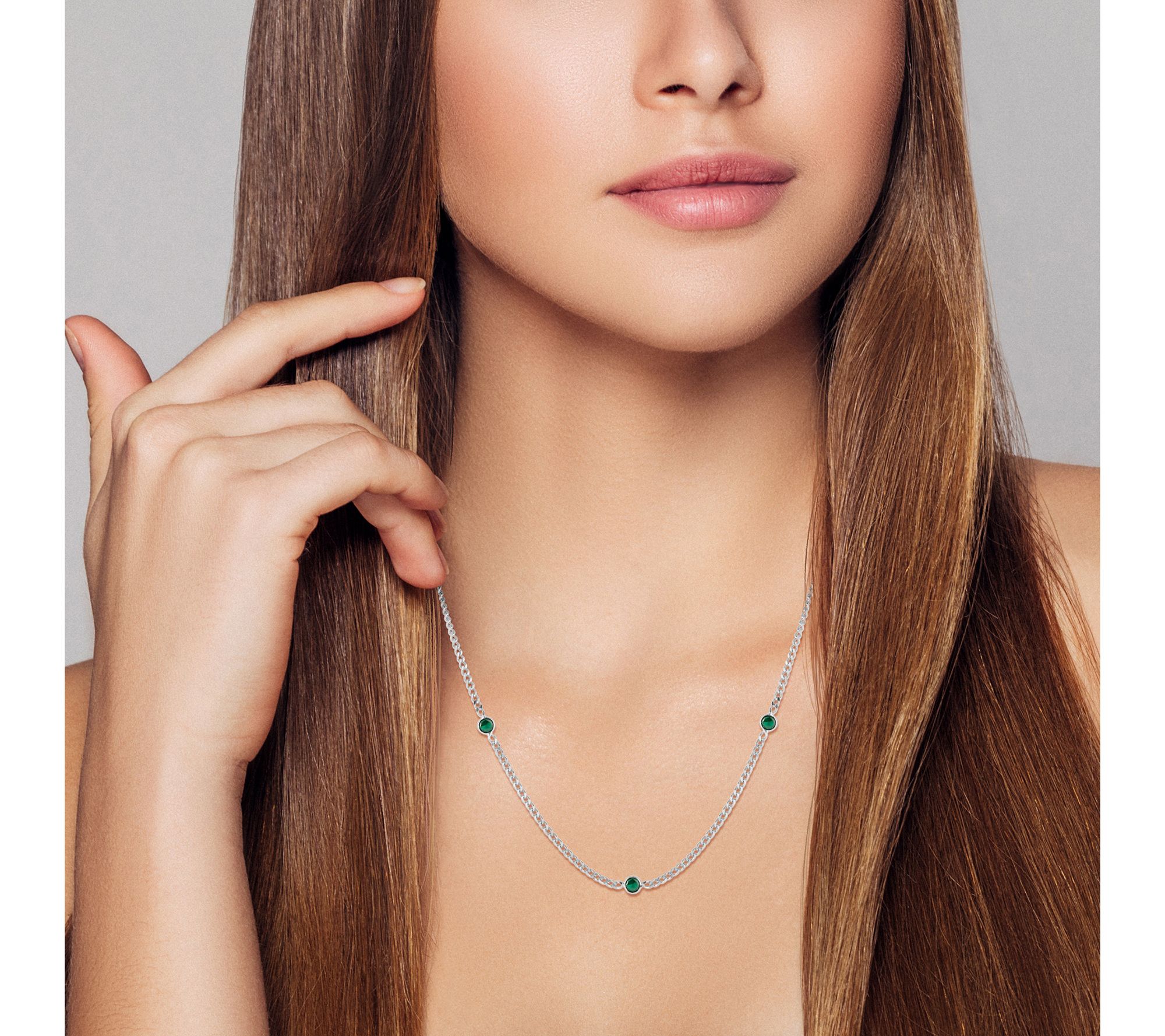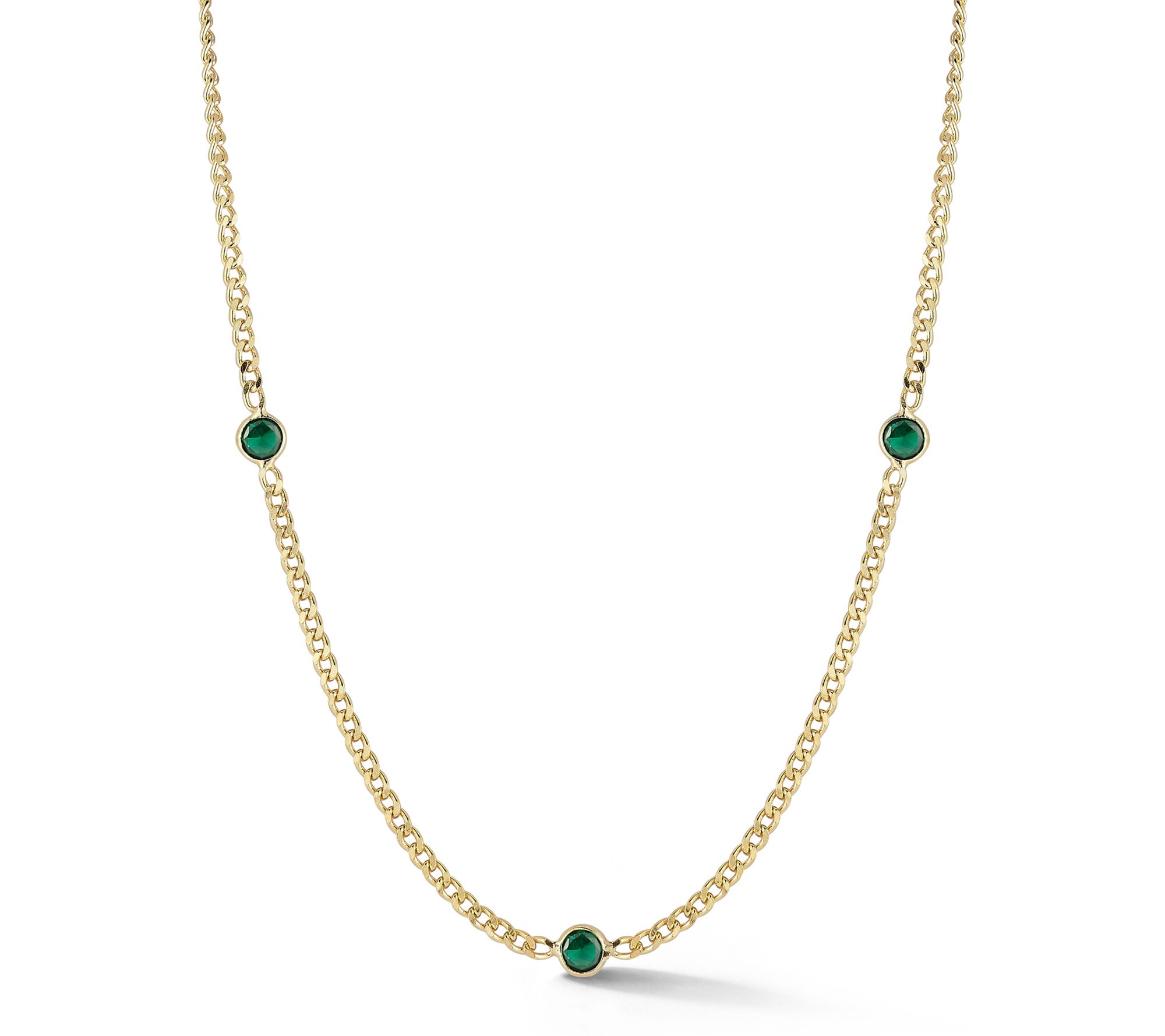 • Round, bezel-set green cubic zirconia stones; curb link chain; stationed design