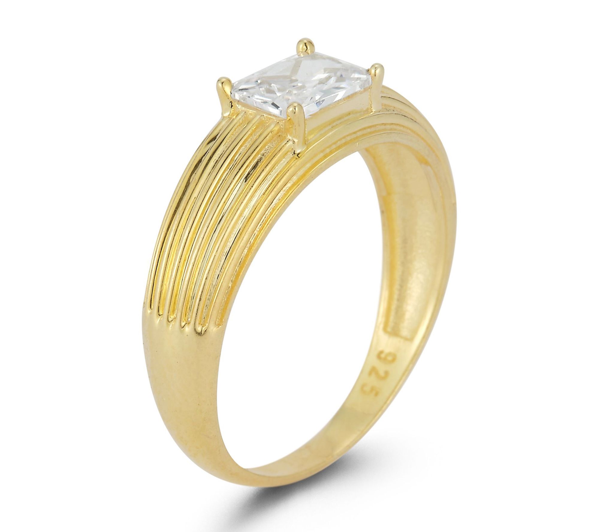 • Emerald-cut, prong-set cubic zirconia stone; textured dome ring band; polished finish