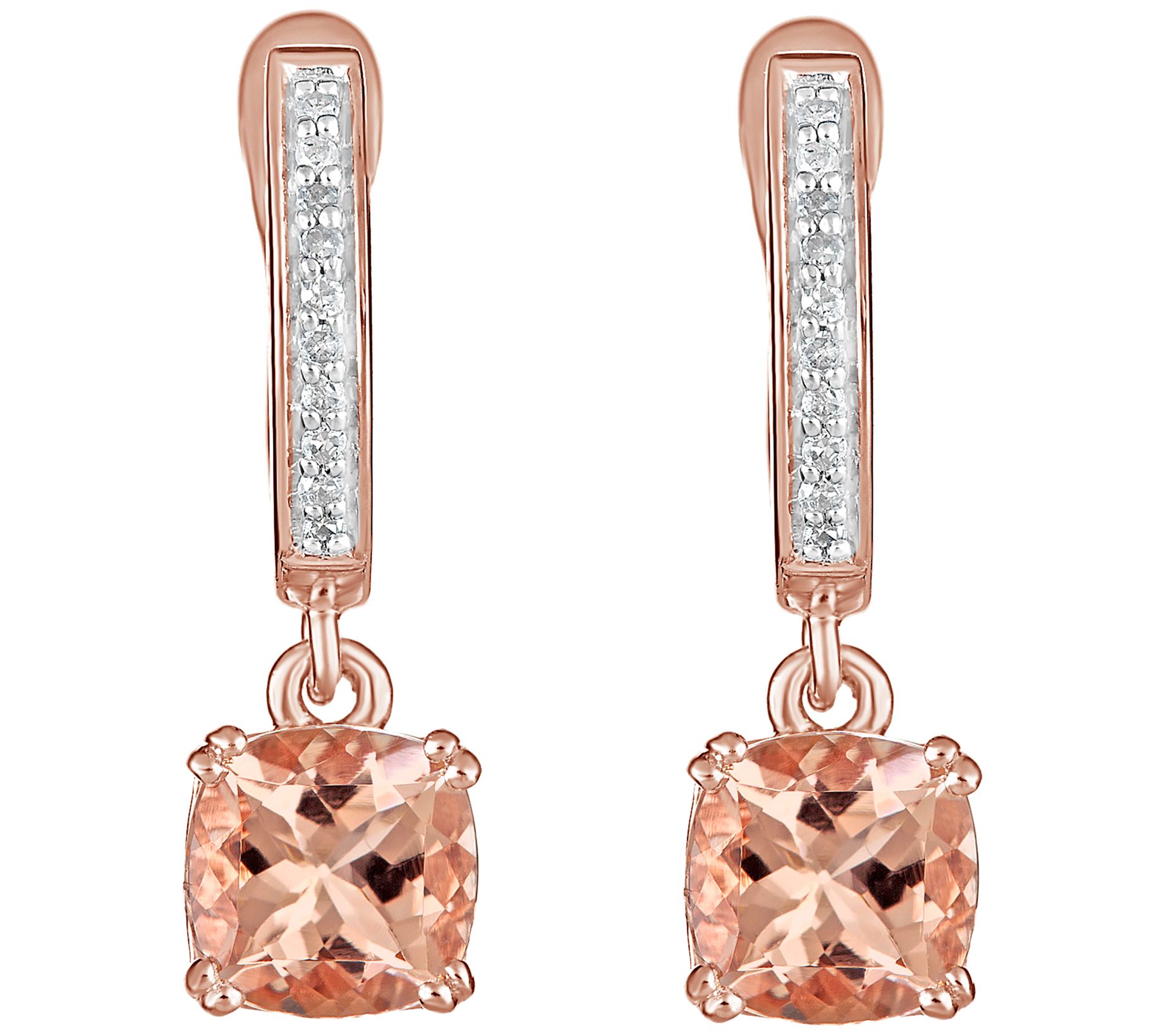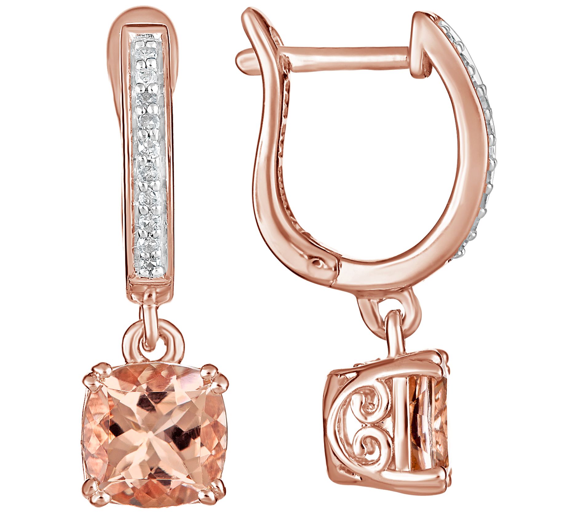 Prettiest pink. These sweet, 14K rose gold-plated sterling silver earrings let a fashionista honor her feminine side. A dazzling, cushion-cut morganite gemstone dangles from a lever back that displays a brilliant row of pave-set diamonds.