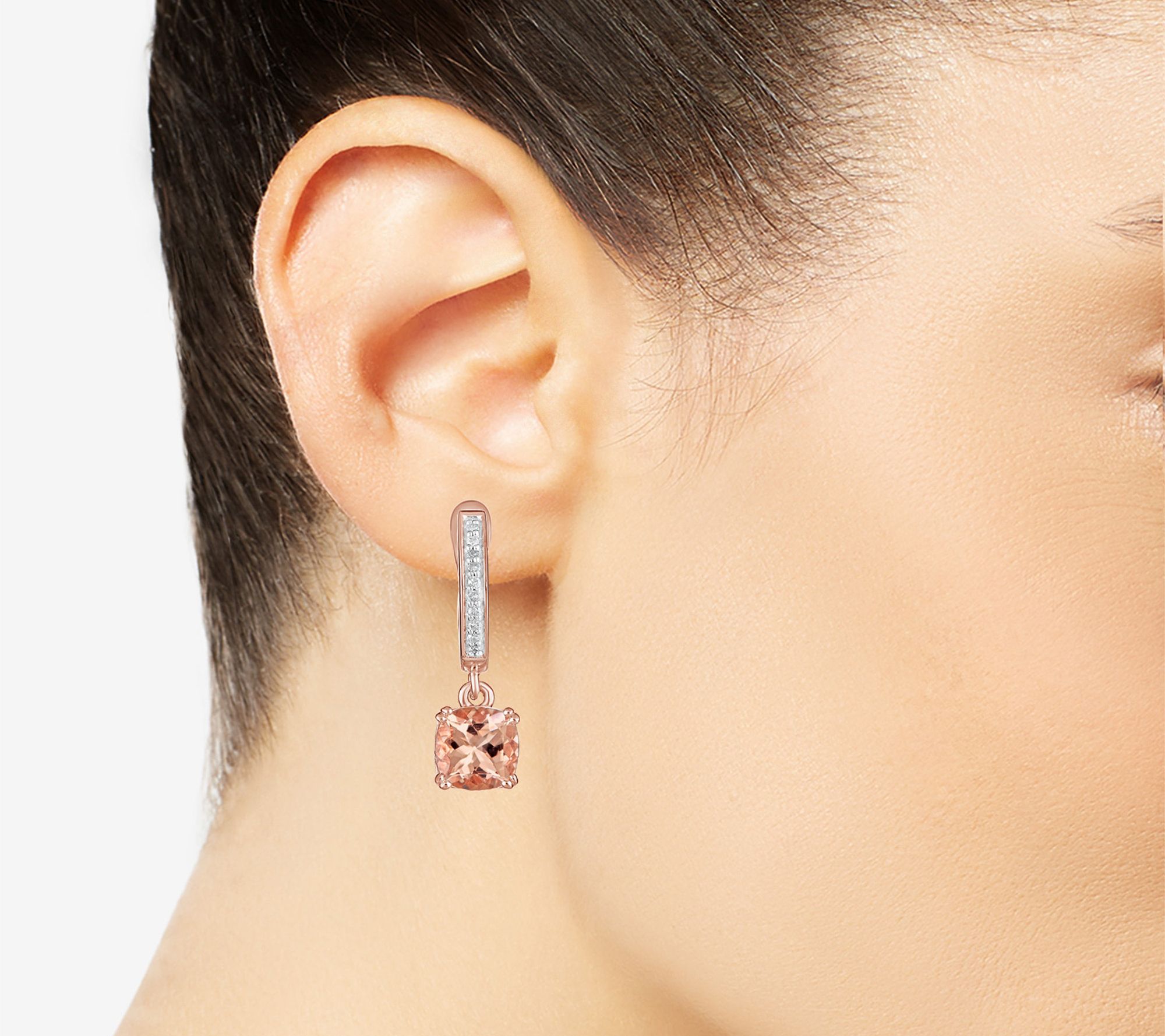 • Prong-set, cushion-cut morganite gemstone dangle; hinged lever back with pave-set diamonds