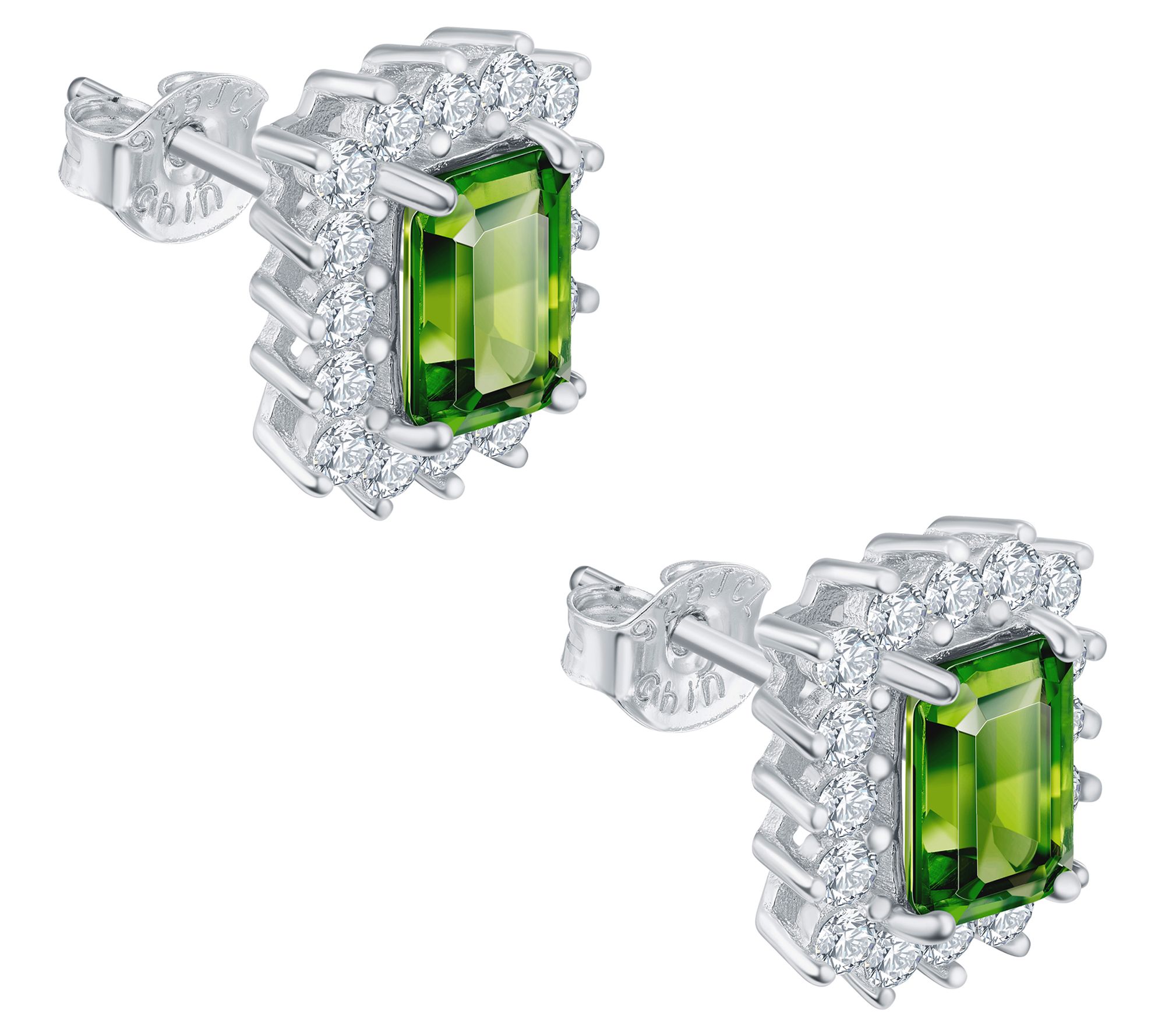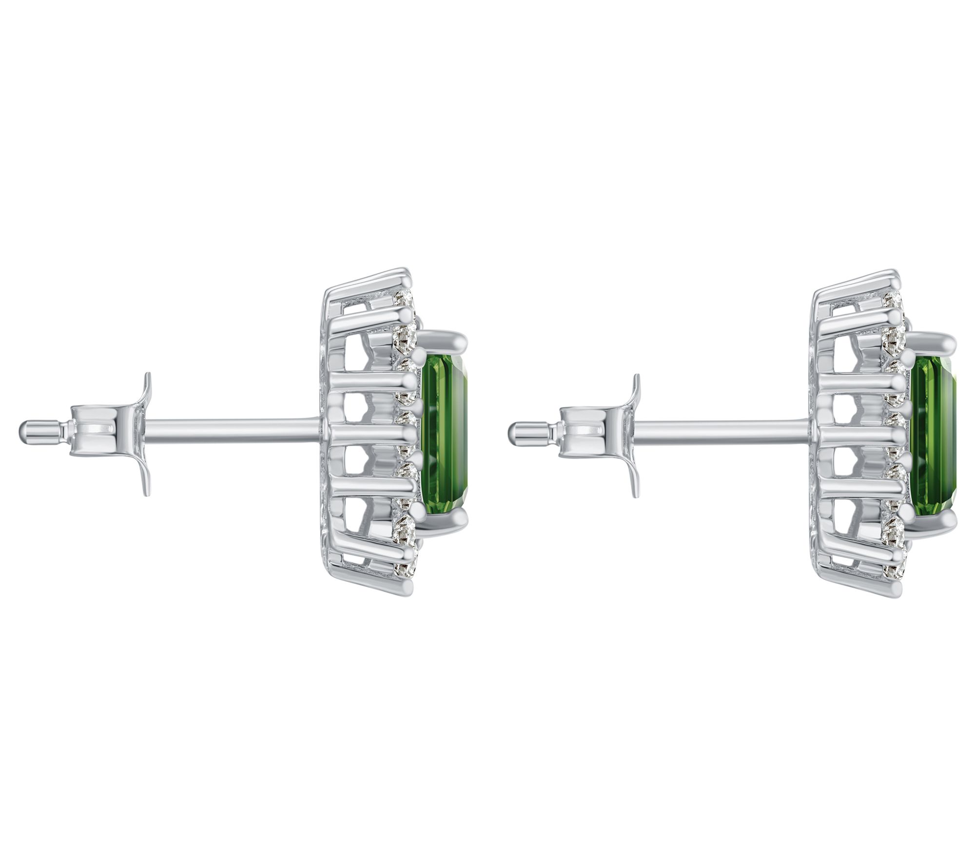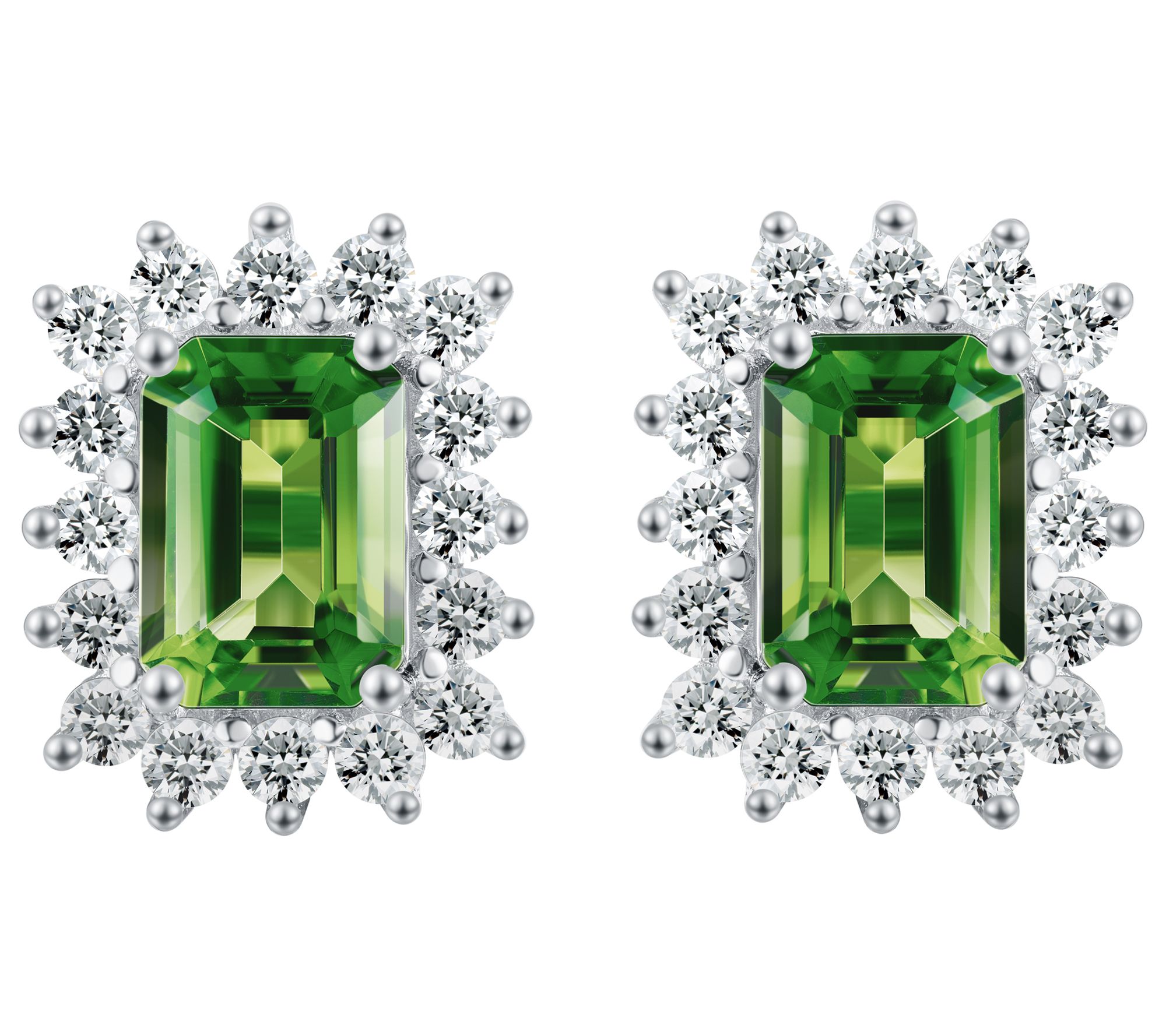 - Emerald-cut prong-set chrome diopside gemstone with a halo of round-cut prong-set white zircon