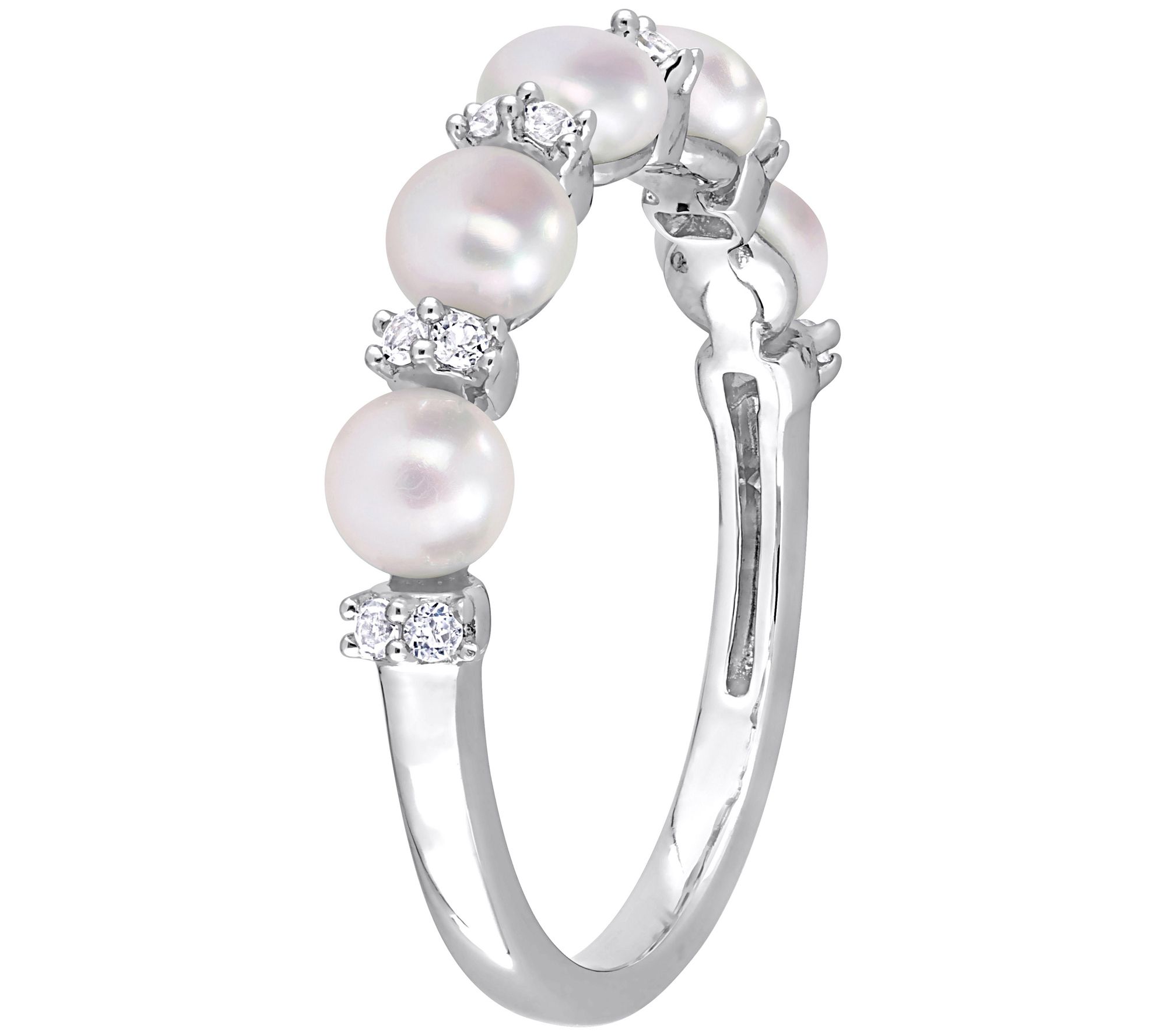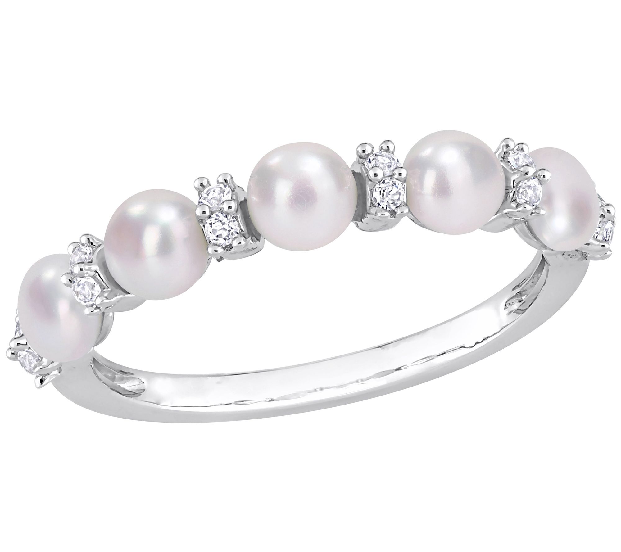 - Semi-eternity ring with button cultured freshwater pearls and round-cut, prong-set white topaz gemstones; polished finish