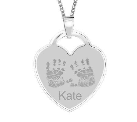 A tangible keepsake of unconditional love, this heart-shaped pendant bears a baby's handprints, and can be personalized with a name of up to eight letters. Crafted from sterling silver, it hangs close to your heart from its fine link chain. A perfect gift for the new mom, or for any special occasion.