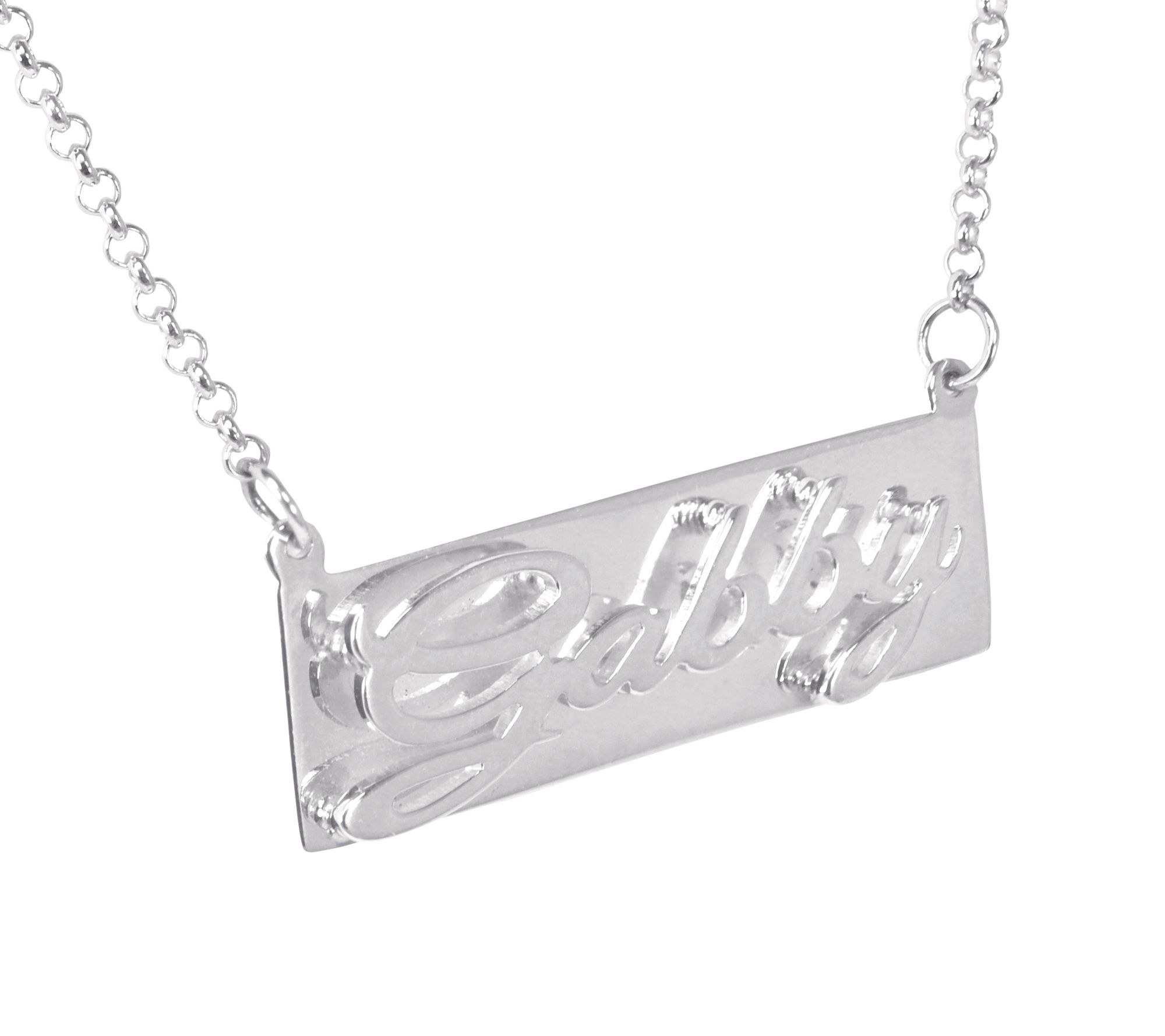 • Rolo link chain; name plate with raised letters; personalized up to eight letters