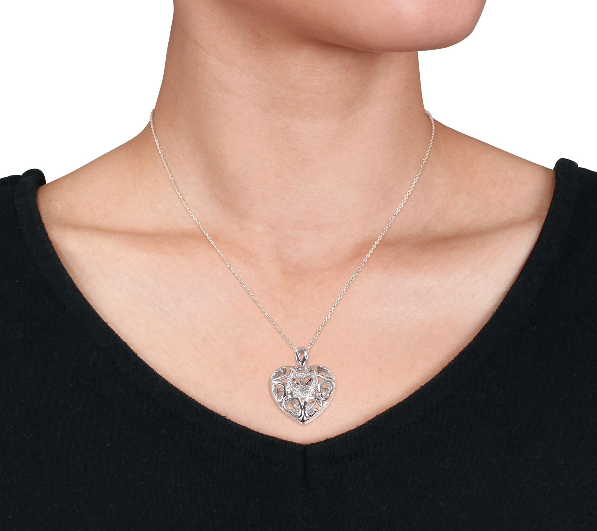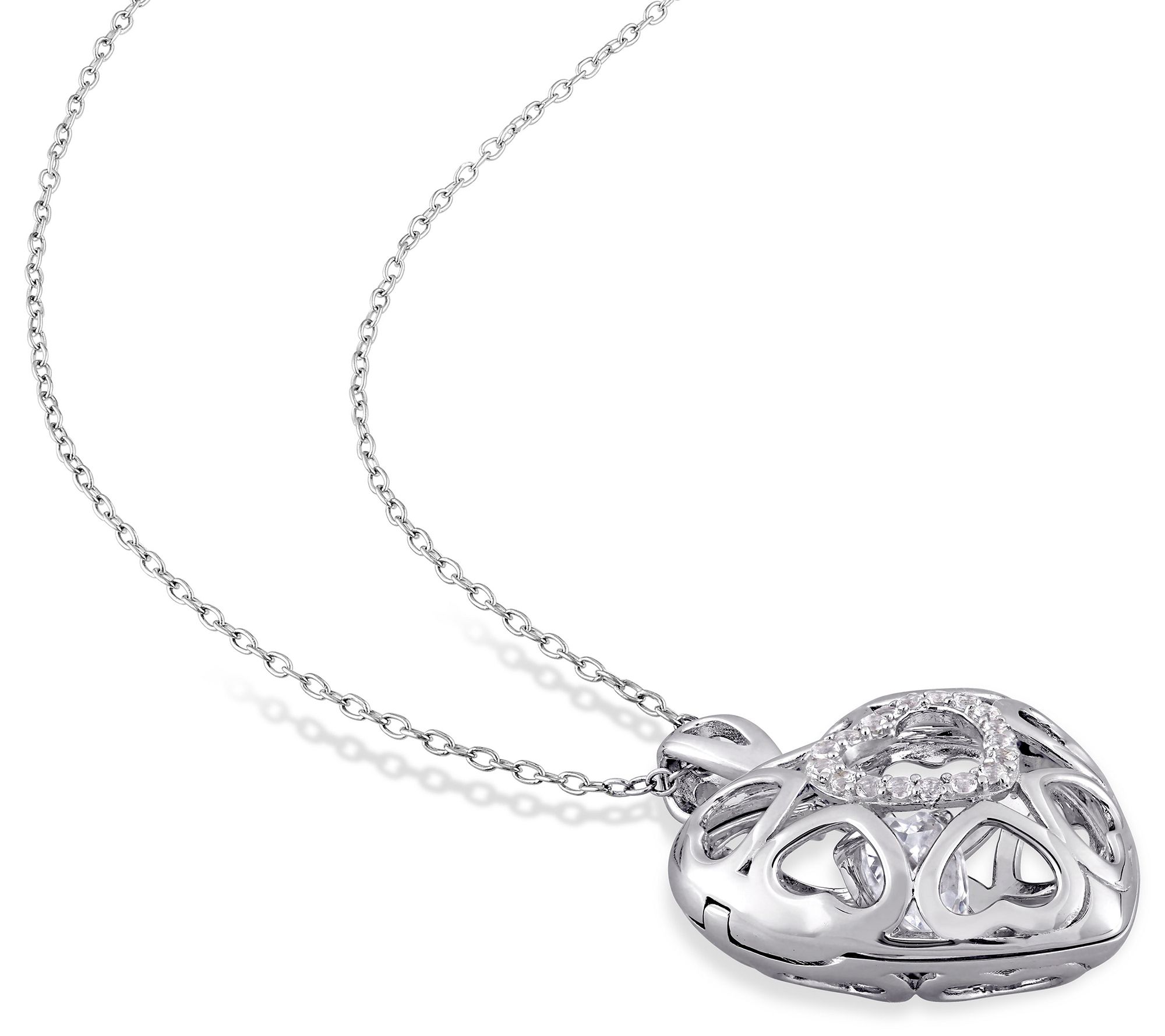 - Heart locket pendant with heart-cut, prong-set white topaz at center; round-cut prong-set white topaz on sides