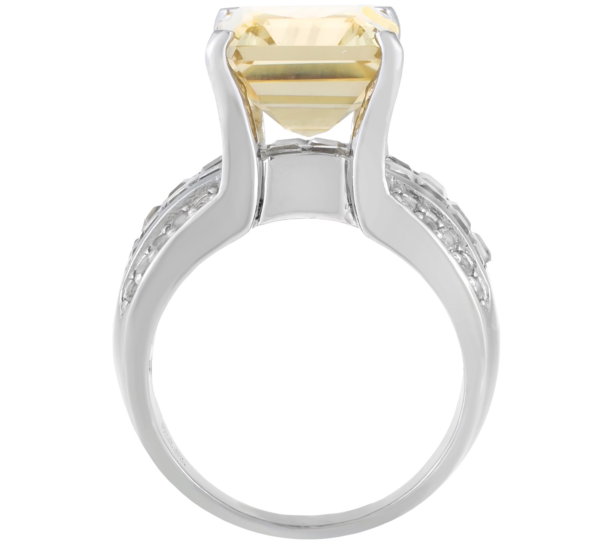 - Prong-set emerald-cut Oregon sunstone gemstone at center; round and princess-cut, channel-set white topaz outline shank