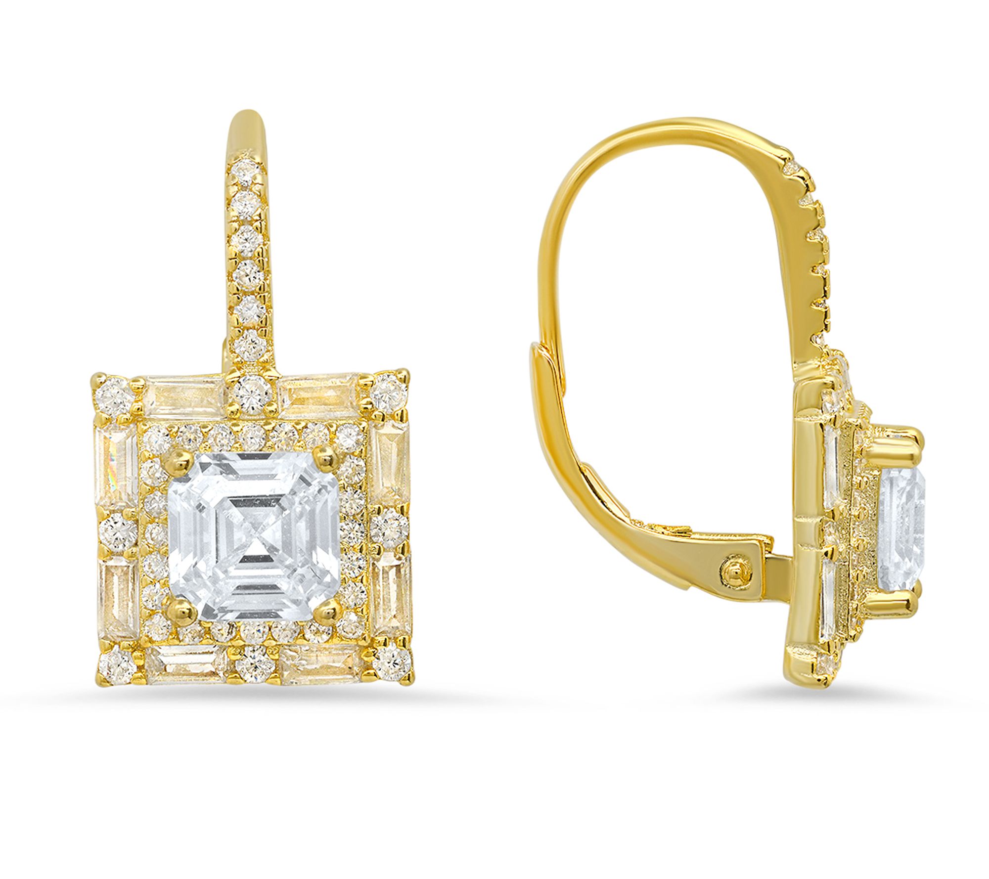 Dress up any ensemble with the breathtaking sparkle and modern elegance of these cubic zirconia earrings. Each earring showcases an asscher-cut stone in the center with a halo of additional stones for extra radiance.