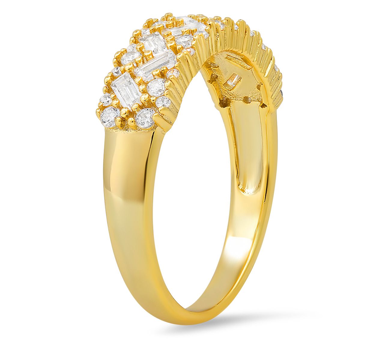 Elevate your jewelry collection with this dazzling band ring. This exquisite piece showcases a harmonious blend of round and baguette-cut cubic zirconia stones, prong-set in sterling silver for a dazzling display of light and luxury. Perfect for any occasion, its versatile design allows for elegant stacking or solo wear, making it an essential accessory for every wardrobe. From everyday elegance to evening glamour, this ring promises to add a sparkling touch to any outfit.