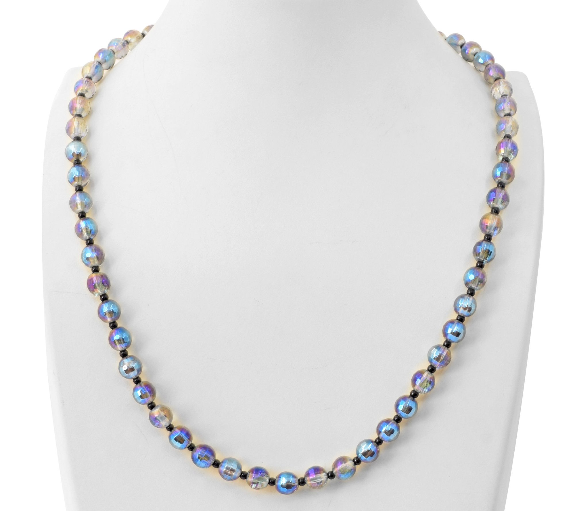 • Faceted blue coated quartz and plain black chalcedony round beads