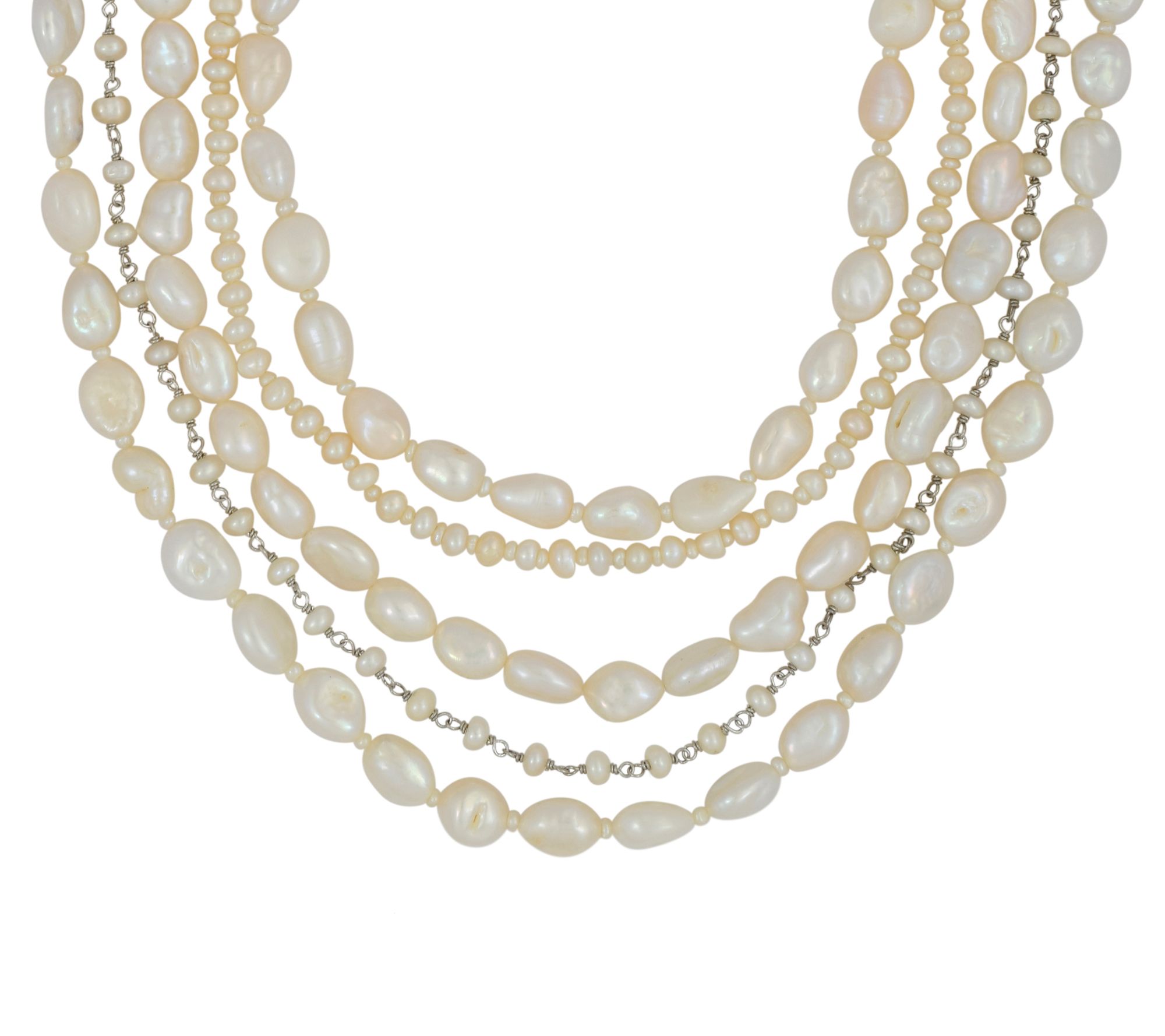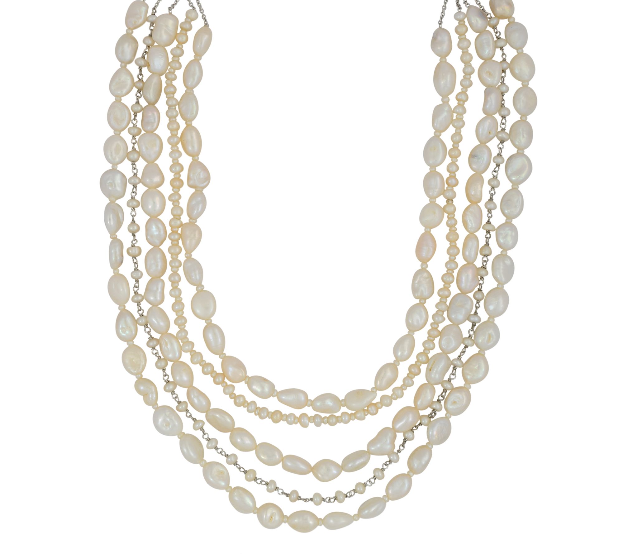 Layer on sophistication with this sterling silver cultured pearl necklace. Whether you're dressing up an evening gown or elevating a casual outfit, its five-strand design featuring beautiful cultured freshwater pearls of various sizes adds timeless elegance. From Affinity.