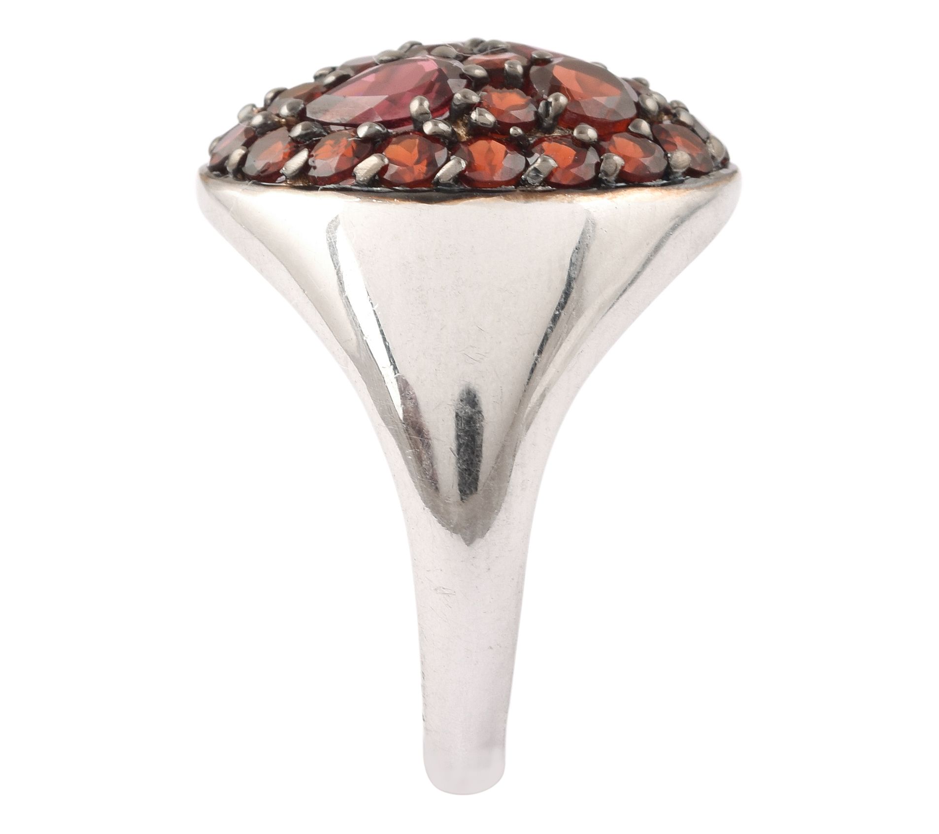 - Clustered garnet and rhodolite gemstones in various shapes and sizes prong-set in oval frame