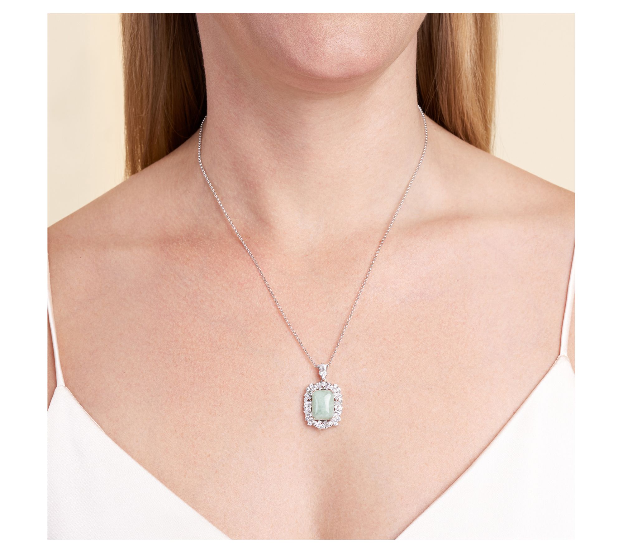 Halo pendant style; jade cabochon center; pave-set cubic zirconia