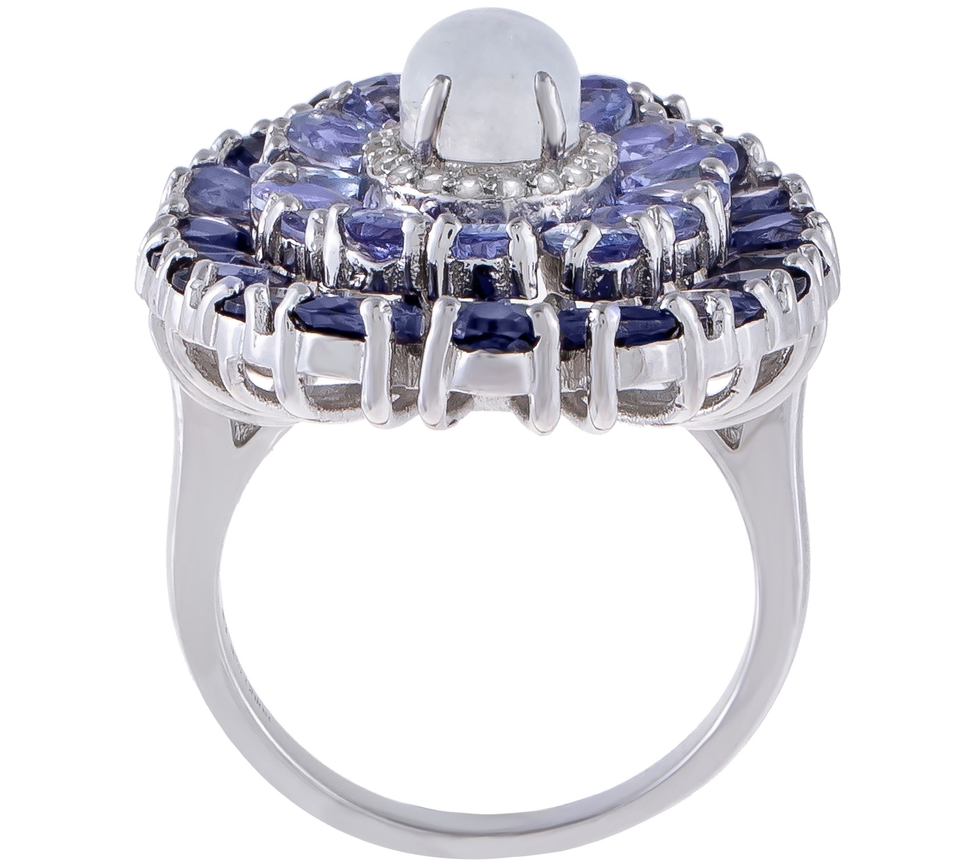 • Oval-cut, prong-set moonstone gemstone; white zircon halo; pear-shaped iolite and tanzanite rows