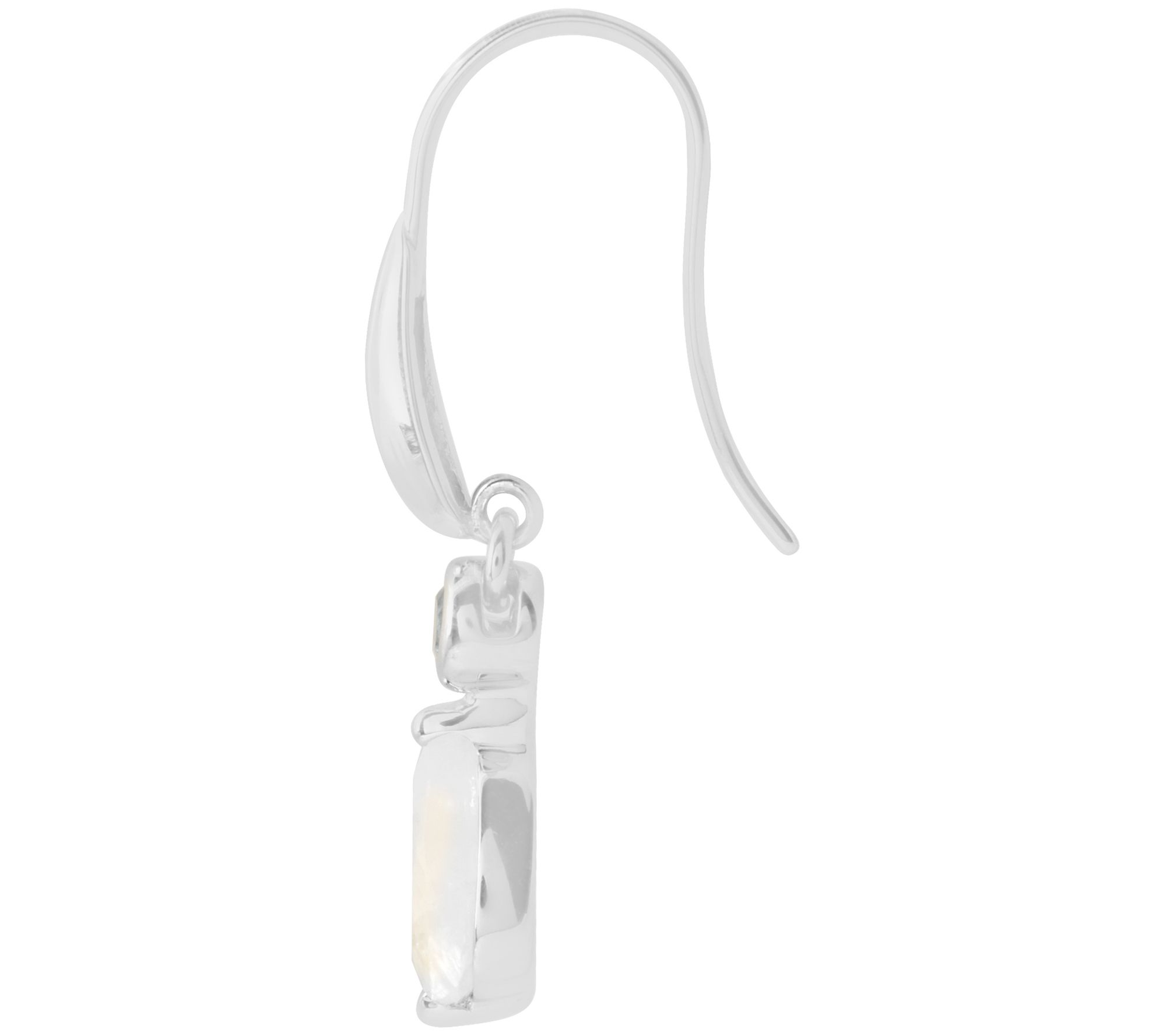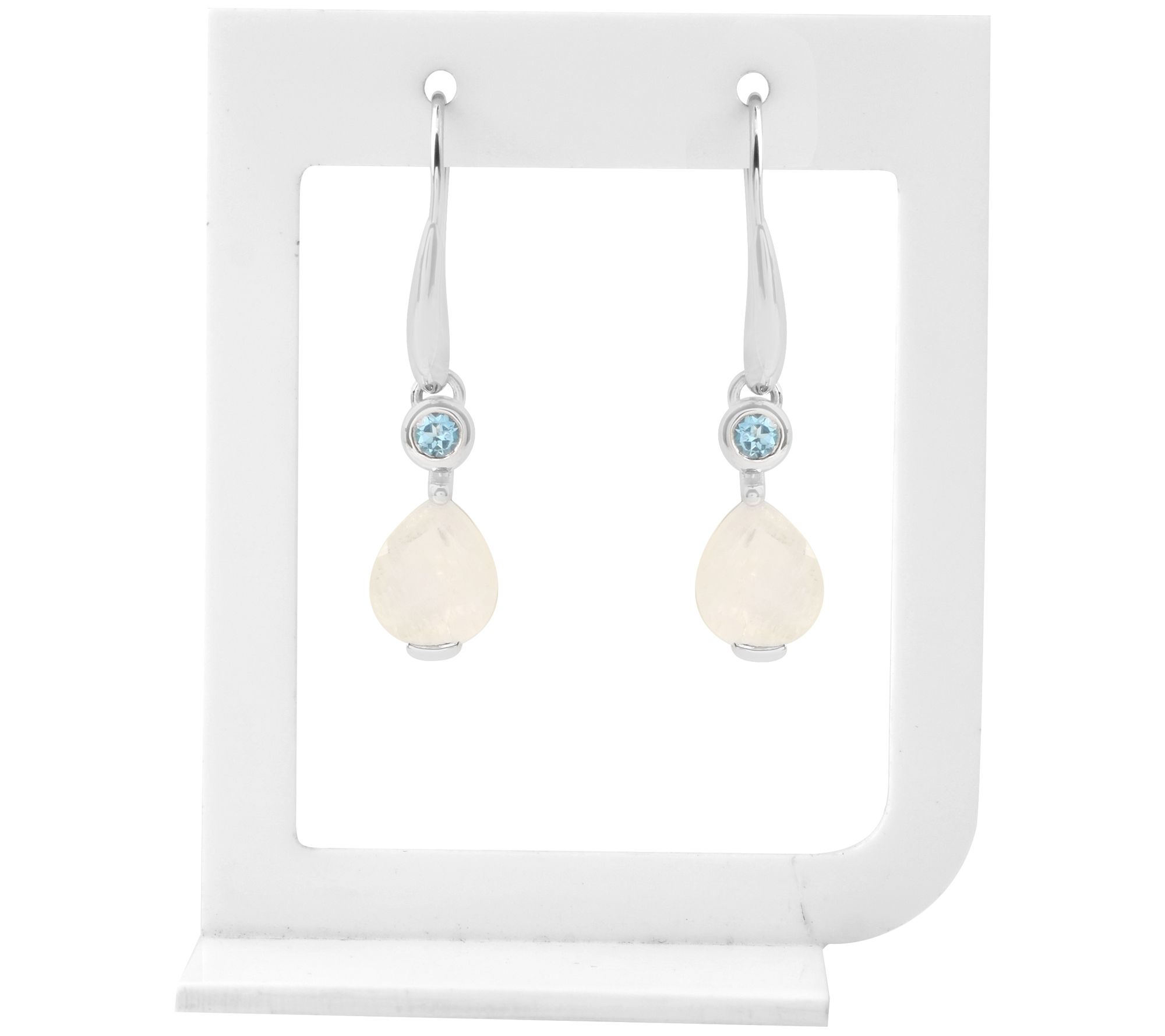 • Dangle design with bezel and prong-set, rainbow moonstone and round-cut, bezel-set Swiss blue topaz