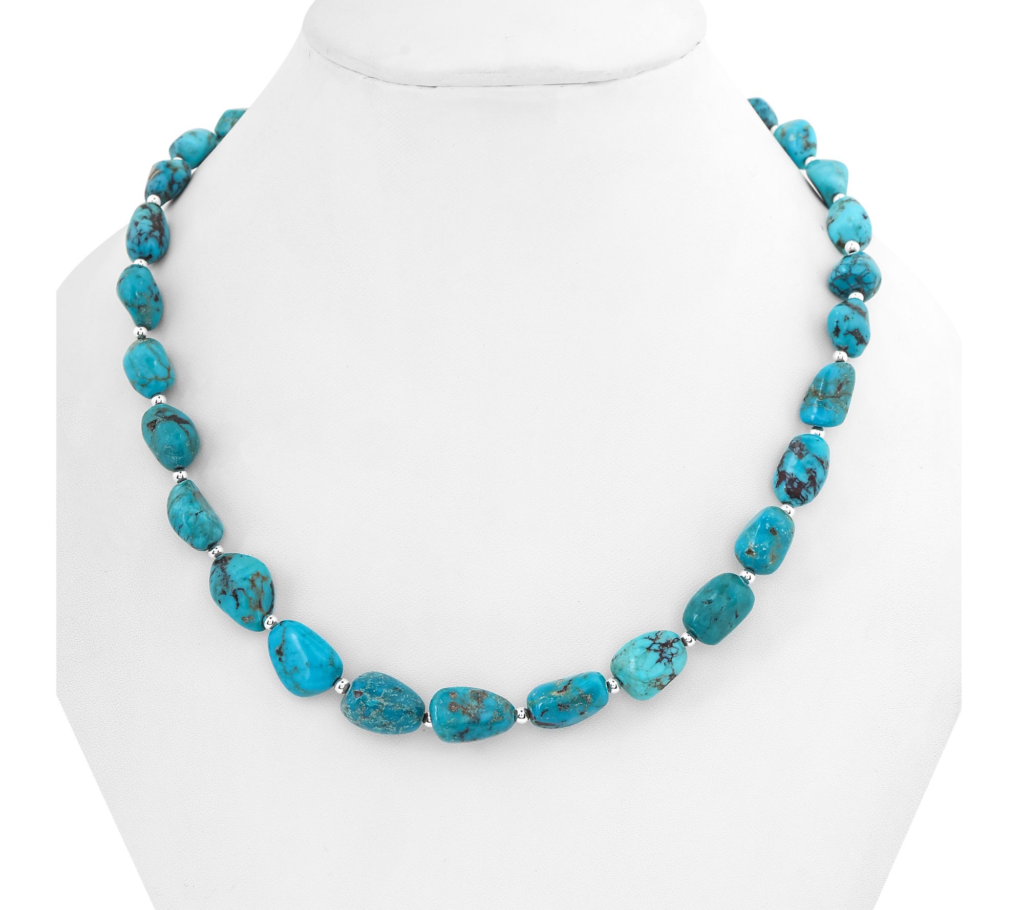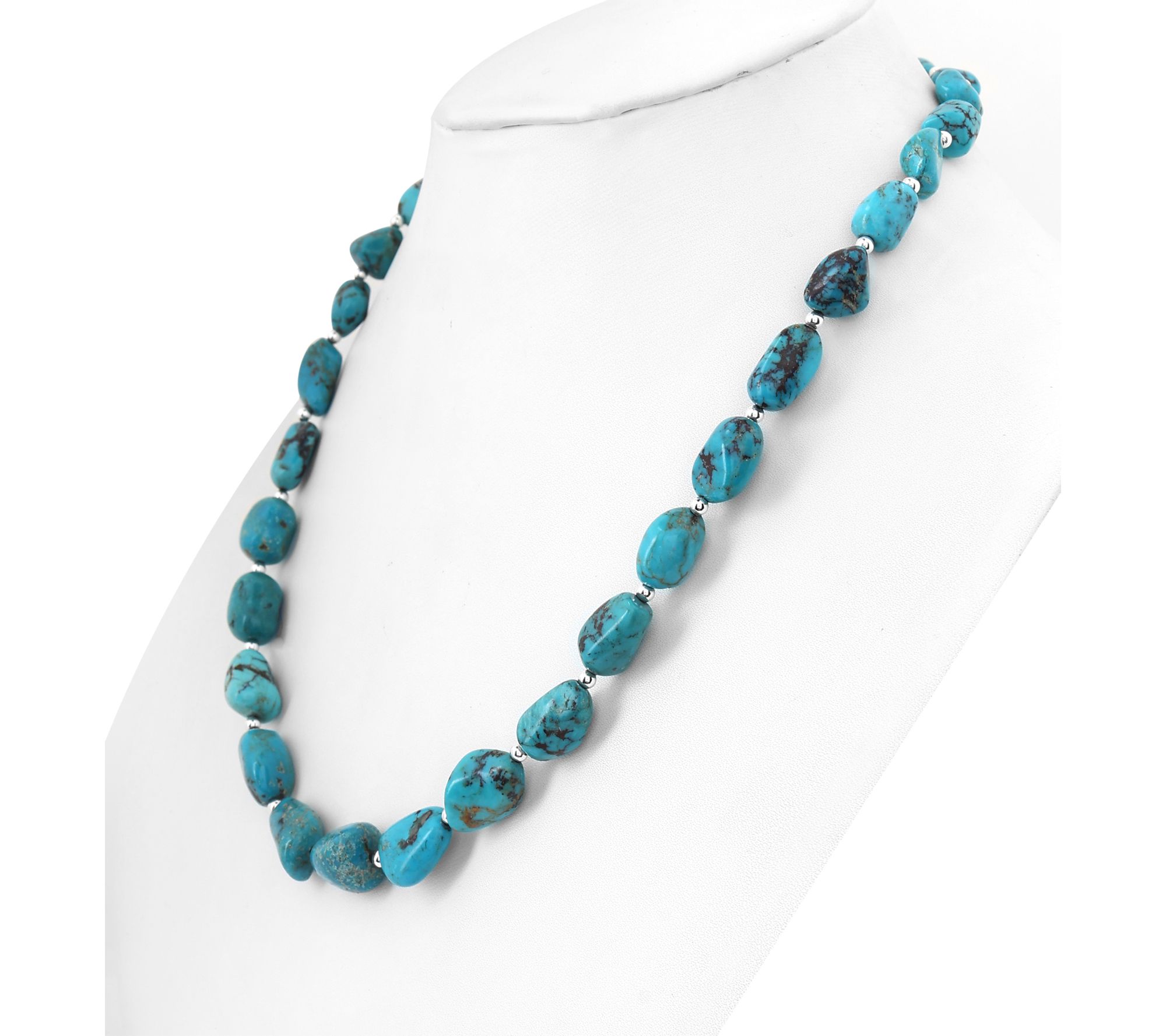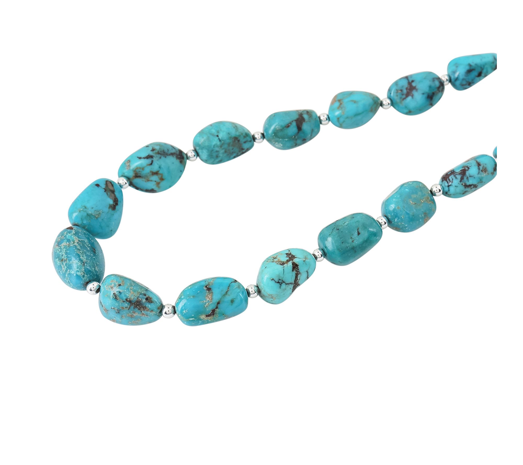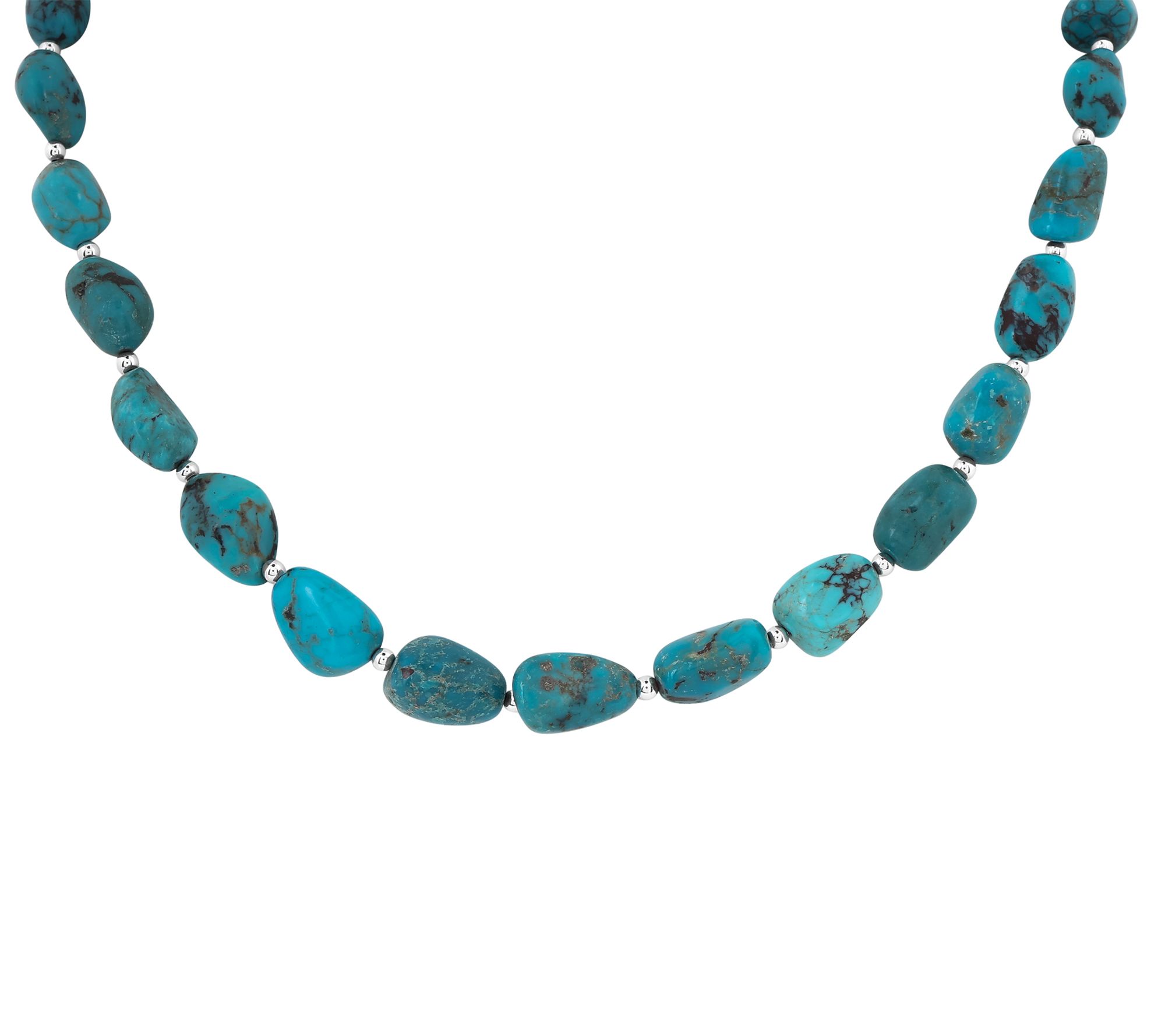 • Necklace features nugget-shaped, full-drill turquoise beads; beaded design; polished sterling silver accents