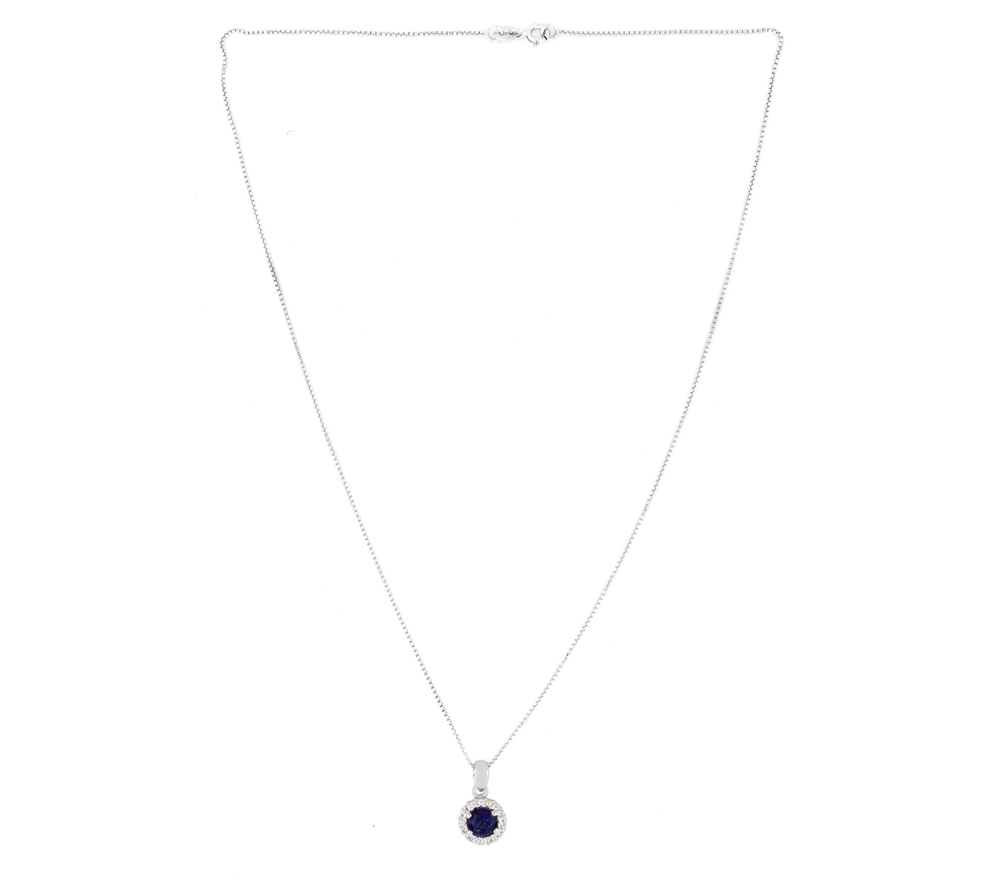 - Round-cut, prong-set sapphire gemstone at center surrounded by round-cut, prong-set white topaz