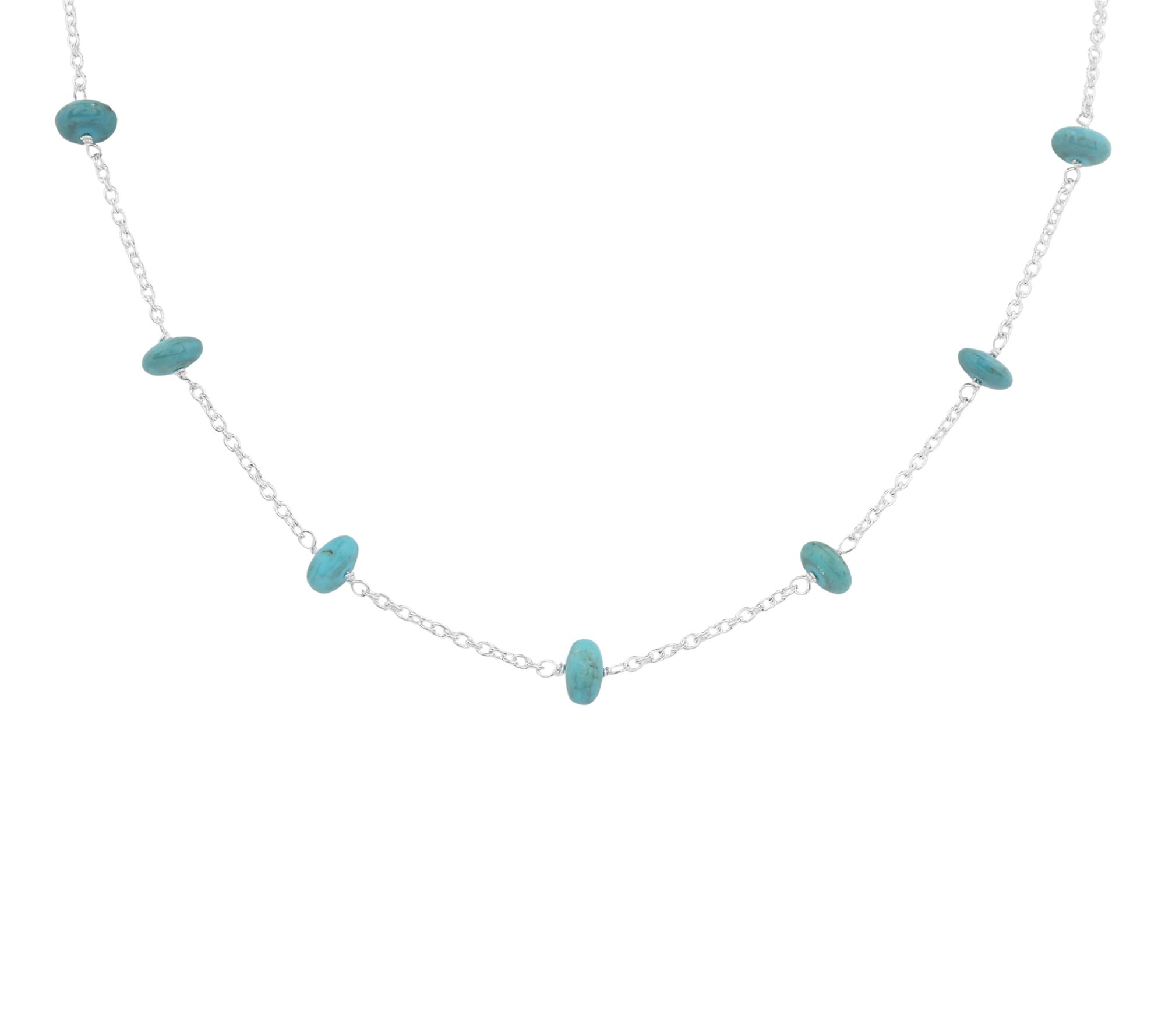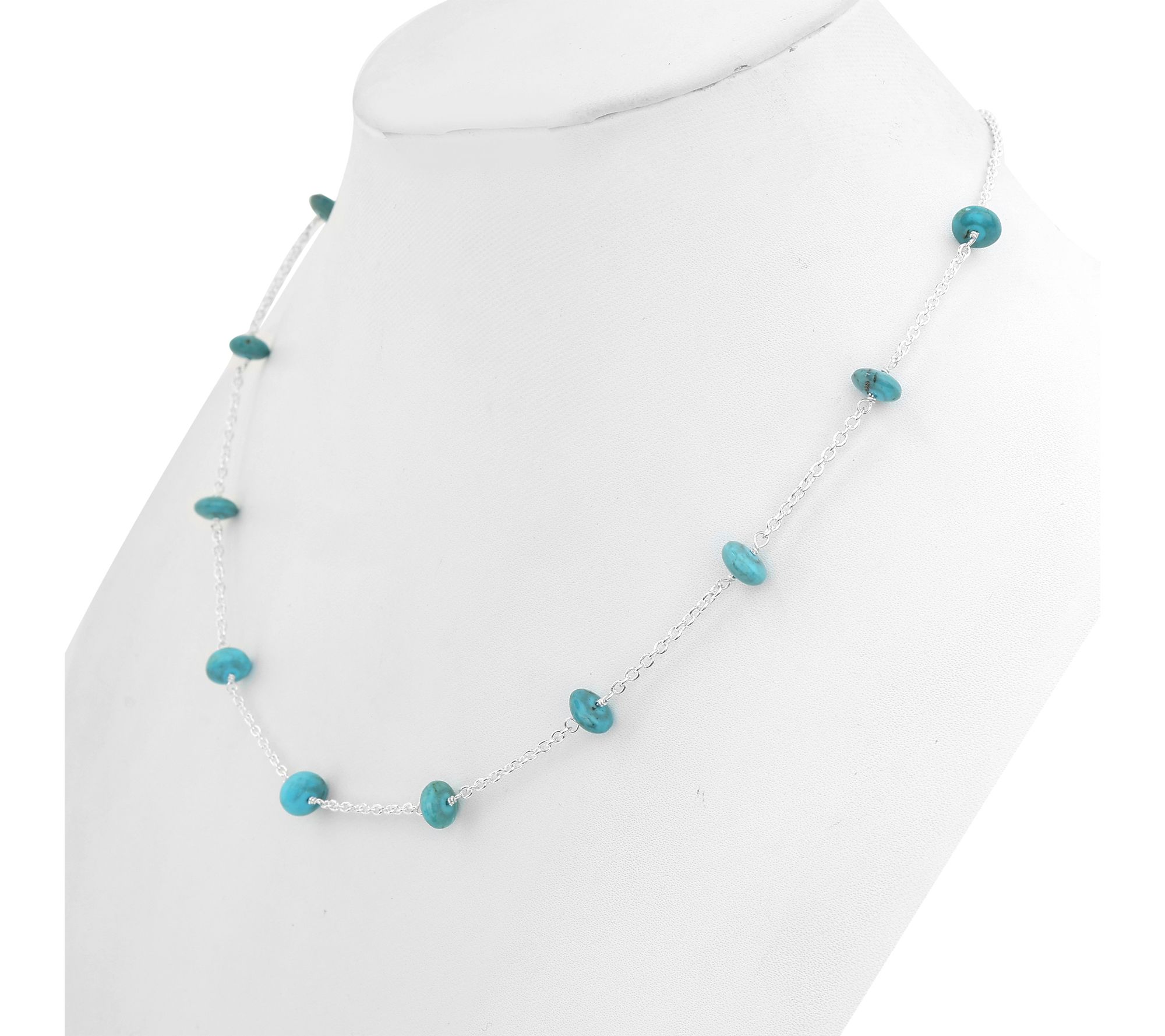 Brighten every day with the vibrant hues of this sterling silver necklace, where glossy roundel beads of Sleeping Beauty turquoise bring a cheerful pop of color to any neckline. Its polished finish and graceful station design make it ideal for adding a touch of elegance to casual outings, weekend brunches, or dressy evenings alike.