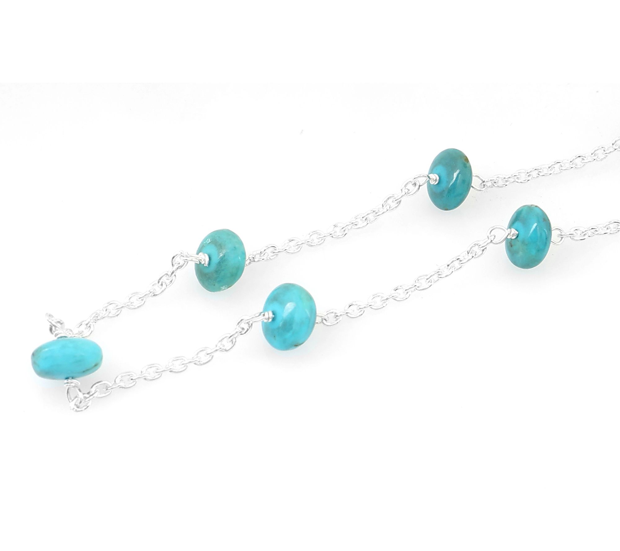 • Polished roundel Sleeping Beauty turquoise beads; oval link chain; station design