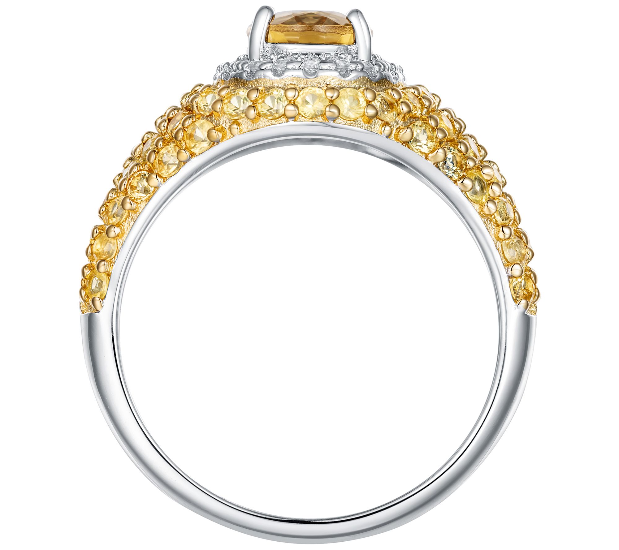 • Oval, prong-set center gemstone; halo of round, prong-set white zircon gemstones; round, prong-set gemstones on shank