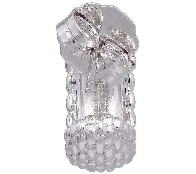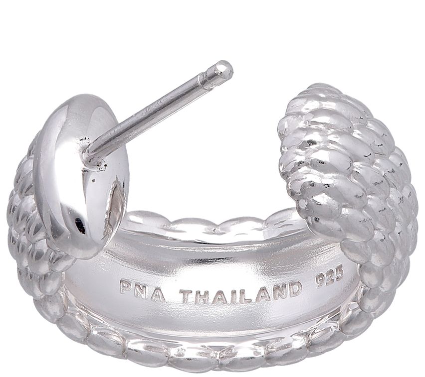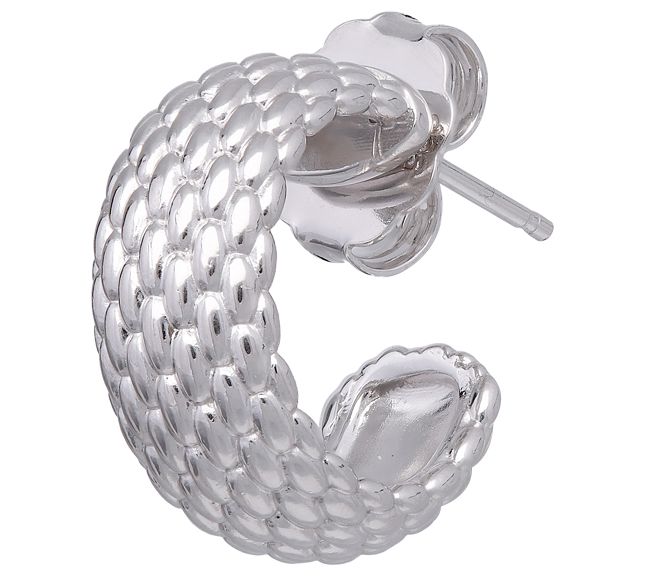 • Woven textured design on open hoop; polished finish