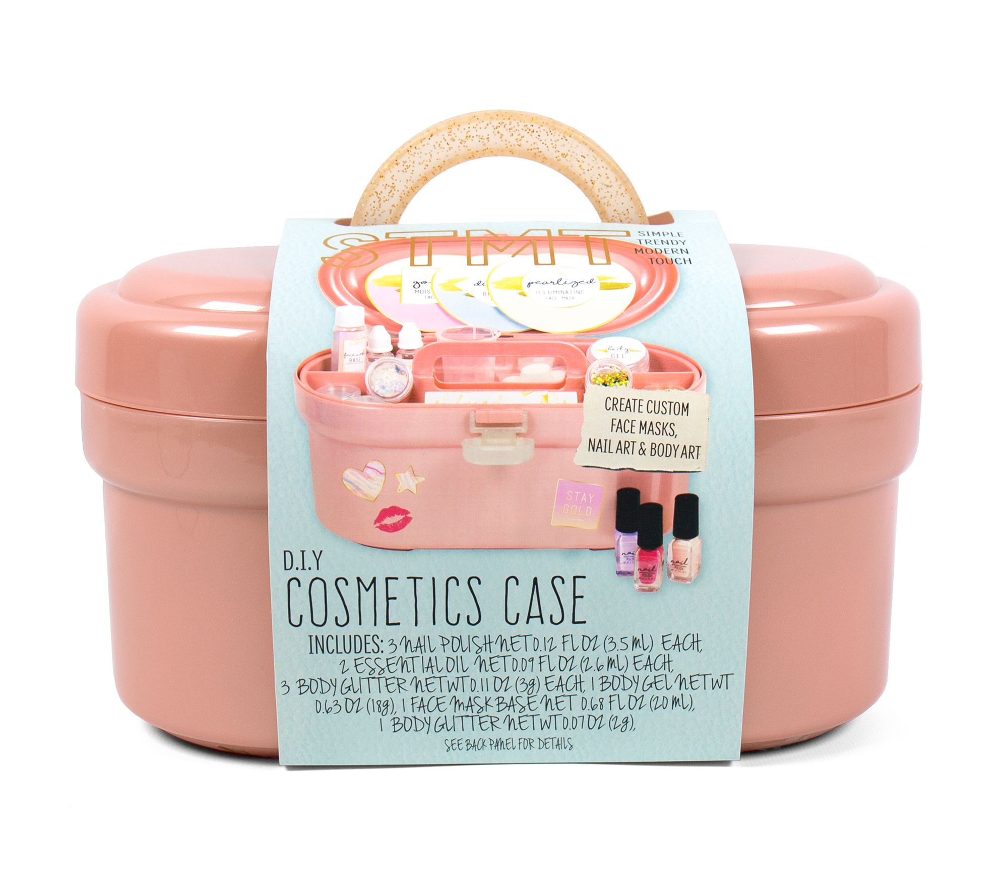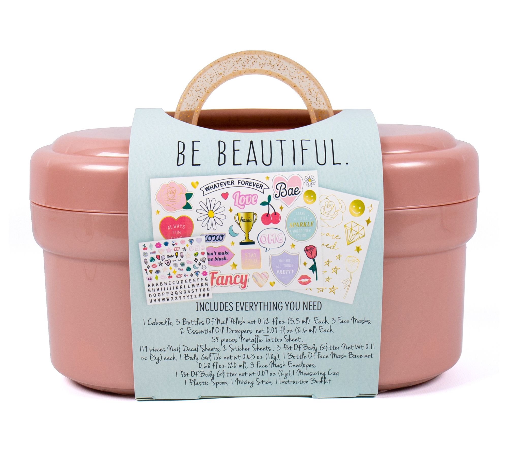 • Includes cosmetic case, three 3.5-ml bottles of nail polish, three face sheet masks, two 2.6-ml essential oil droppers, nail decal, sticker sheet, two wooden mixing sticks, four pots of glitter, metallic tattoo sheet, 20-ml bottle of face mask base, 18-gram tub of body gel, three face mask envelopes, measuring cup, plastic spoon, and instructions