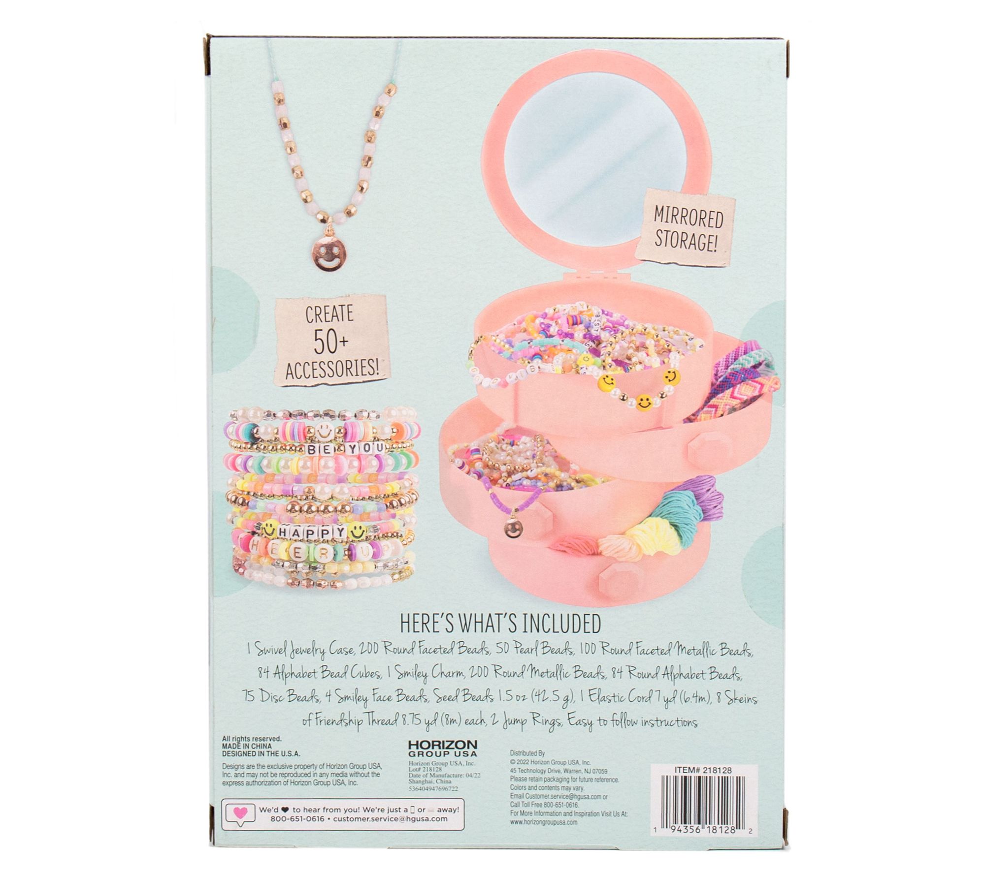 • Includes 300 round faceted beads, 50 pearl beads, 5-yd bundle of elastic cord, 168 alphabet beads, emoji charm, 100 round metallic beads, 75 disc beads, eight 8.75-yd bundles of friendship thread, four smiley face beads, five seed bead packets, two butterfly beads, swivel jewelry case, and instructions