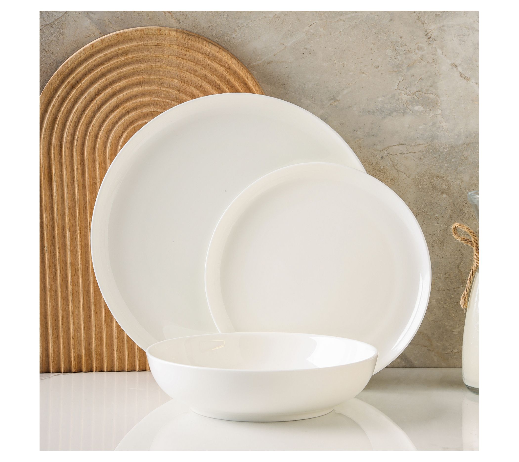 Add a touch of uncomplicated elegance that's perfect for everyday dinners or formal affairs, this 12-piece set of Gabrielle bone china dinnerware is microwave-safe for quick reheating and dishwasher-safe for easy cleanup. From Stone + Lain.