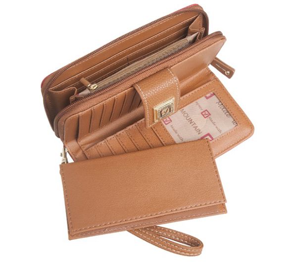• 14 card slots, two ID slots, five bill/receipt slots, removable checkbook holder with slot, interior zip pocket
