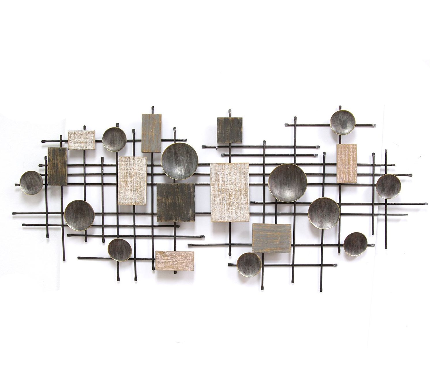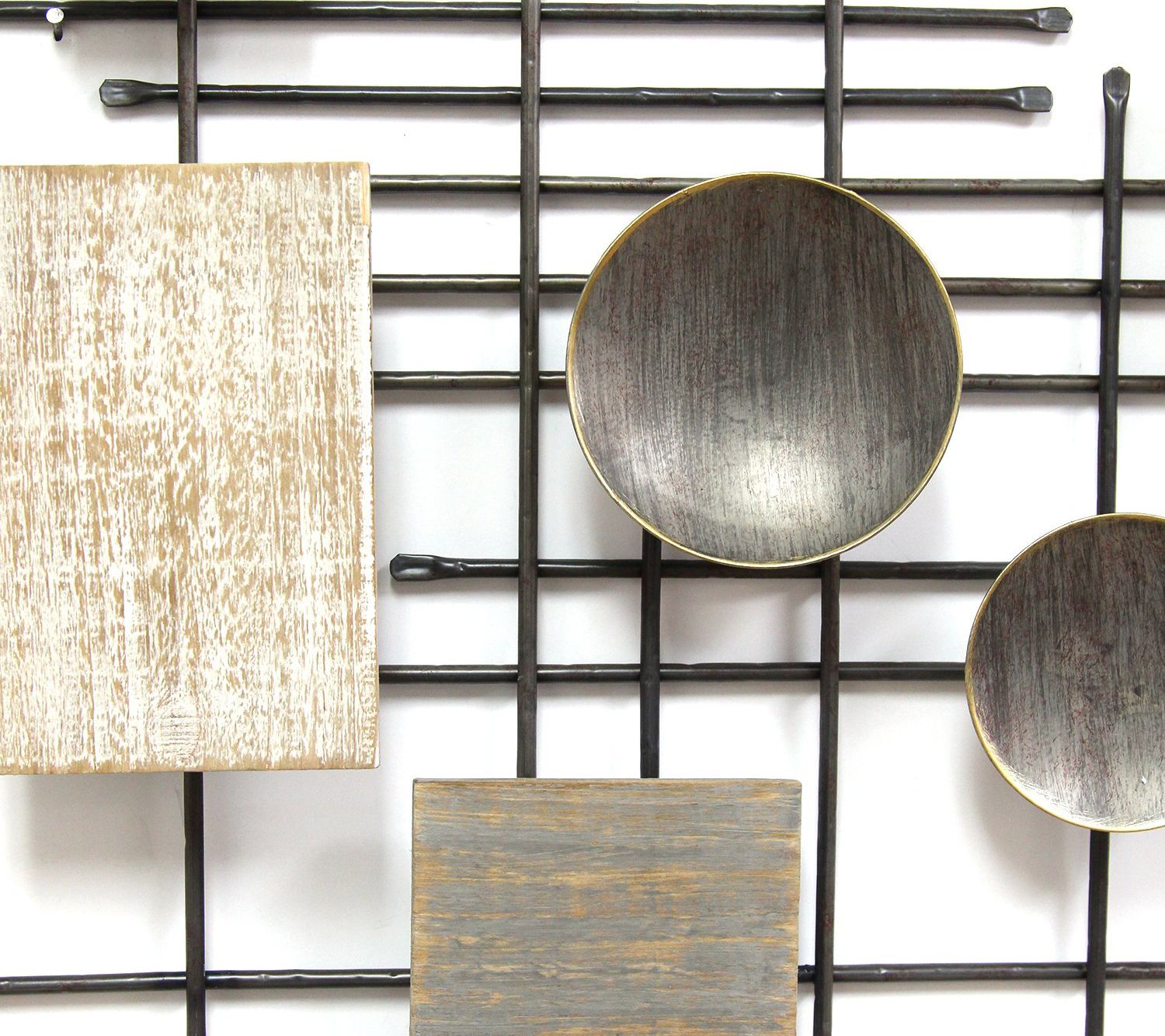 With an abstract design featuring distressed wood pieces and metal circles and lines, this striking wall art adds style and dimension to any room. From Stratton Home Decor.