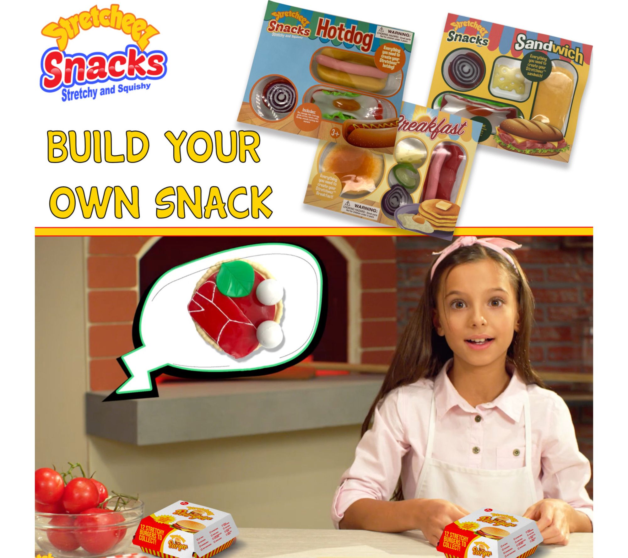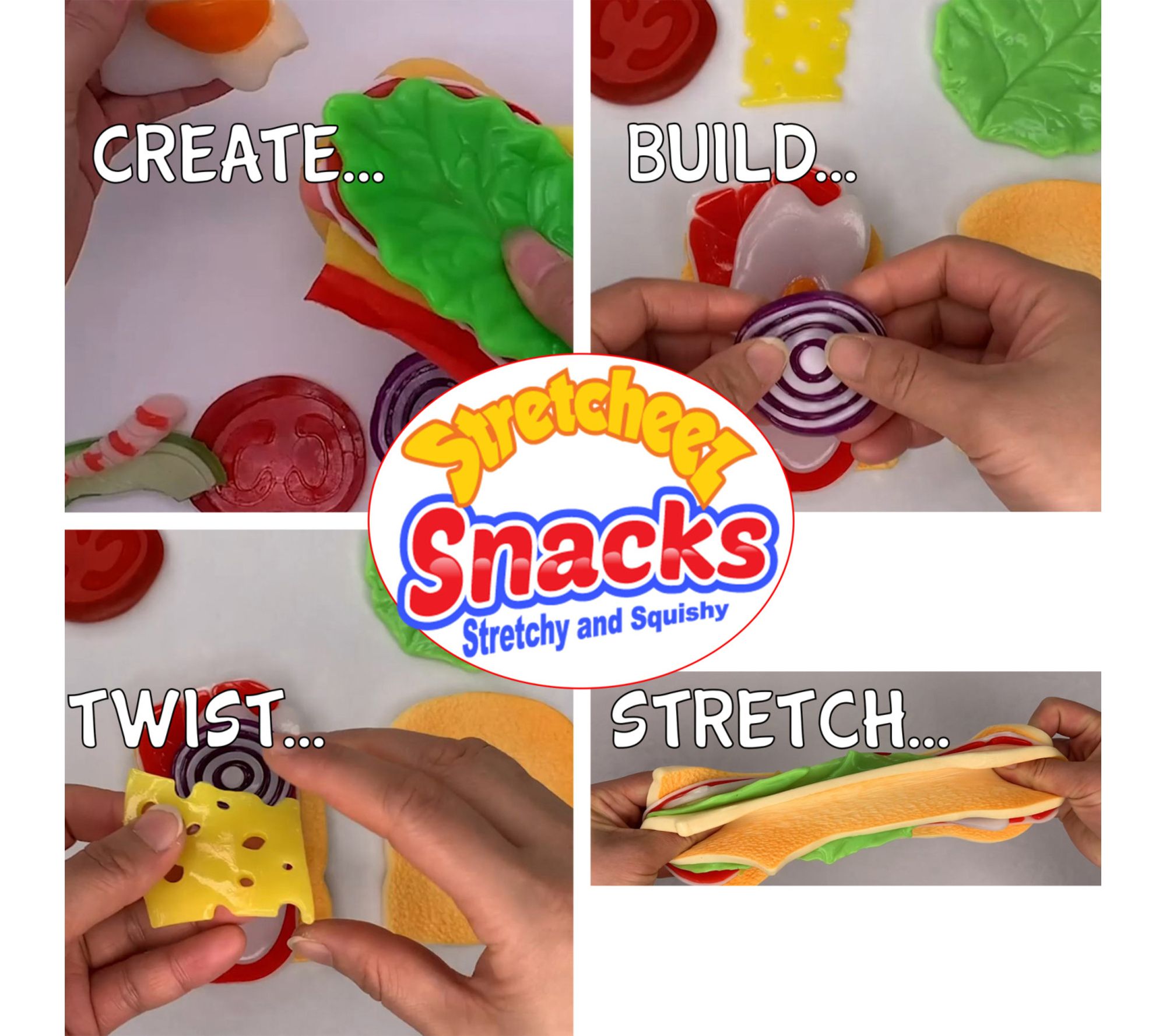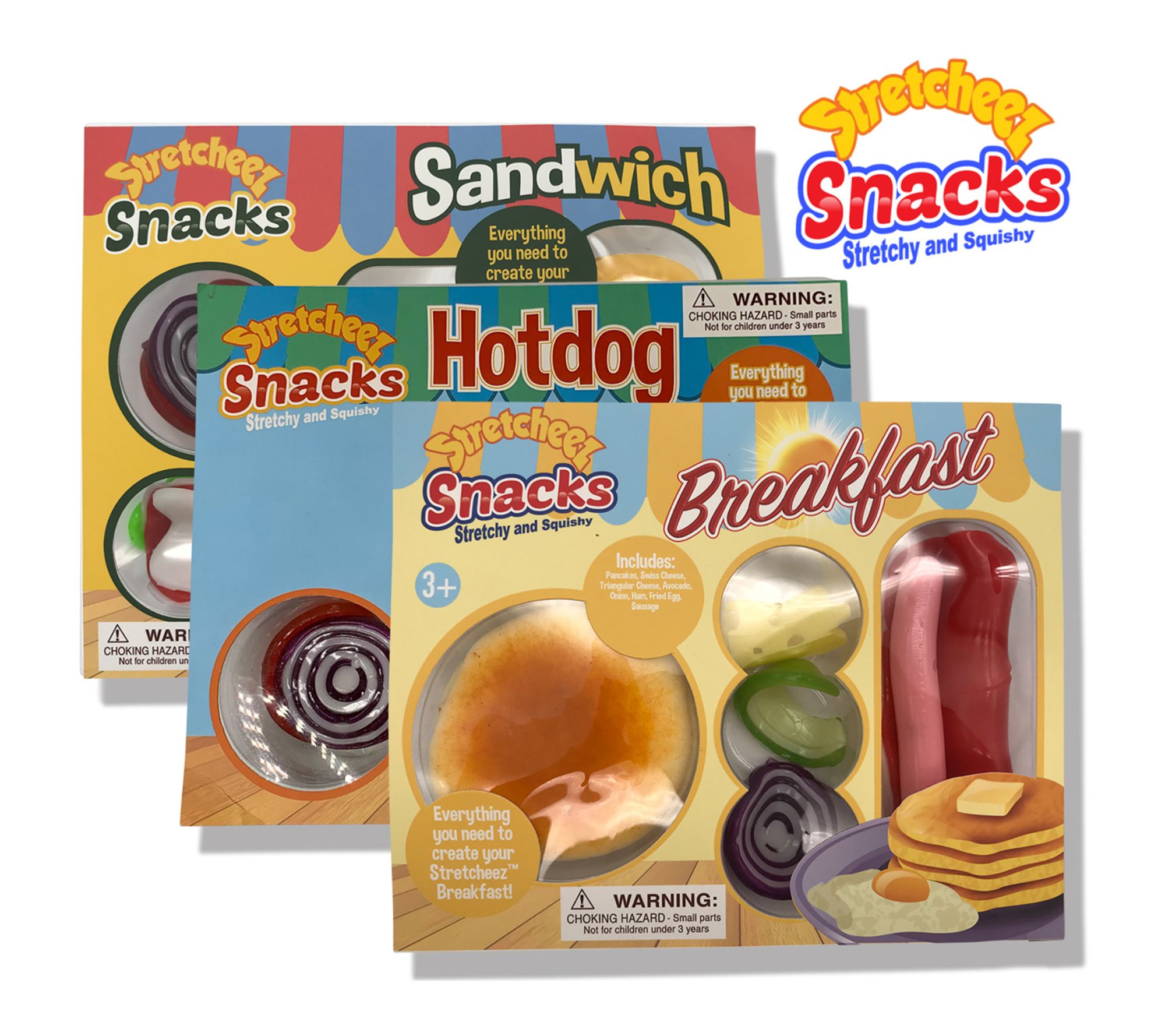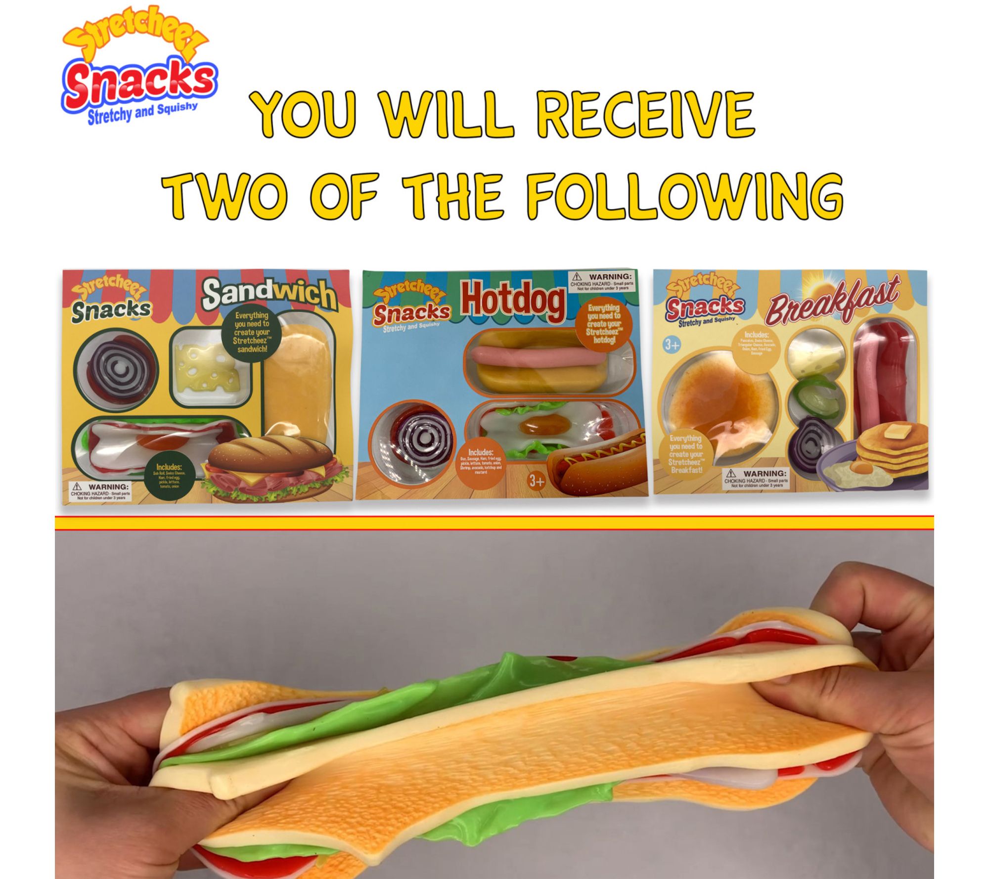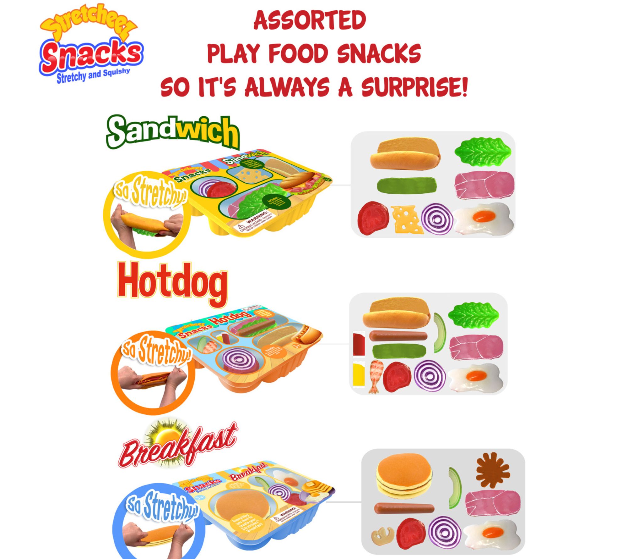 Give your little one a hands-on adventure with a Stretcheez Snacks 2 pack -- realistic, squishy play food that stretches, twists, and snaps back, turning any play kitchen into a feast of creativity. Every surprise assortment ignites imaginative scenarios, whether it's breakfast, sandwich, or hotdog fun -- just wipe clean and let the sensory excitement continue. From Stretcheez.