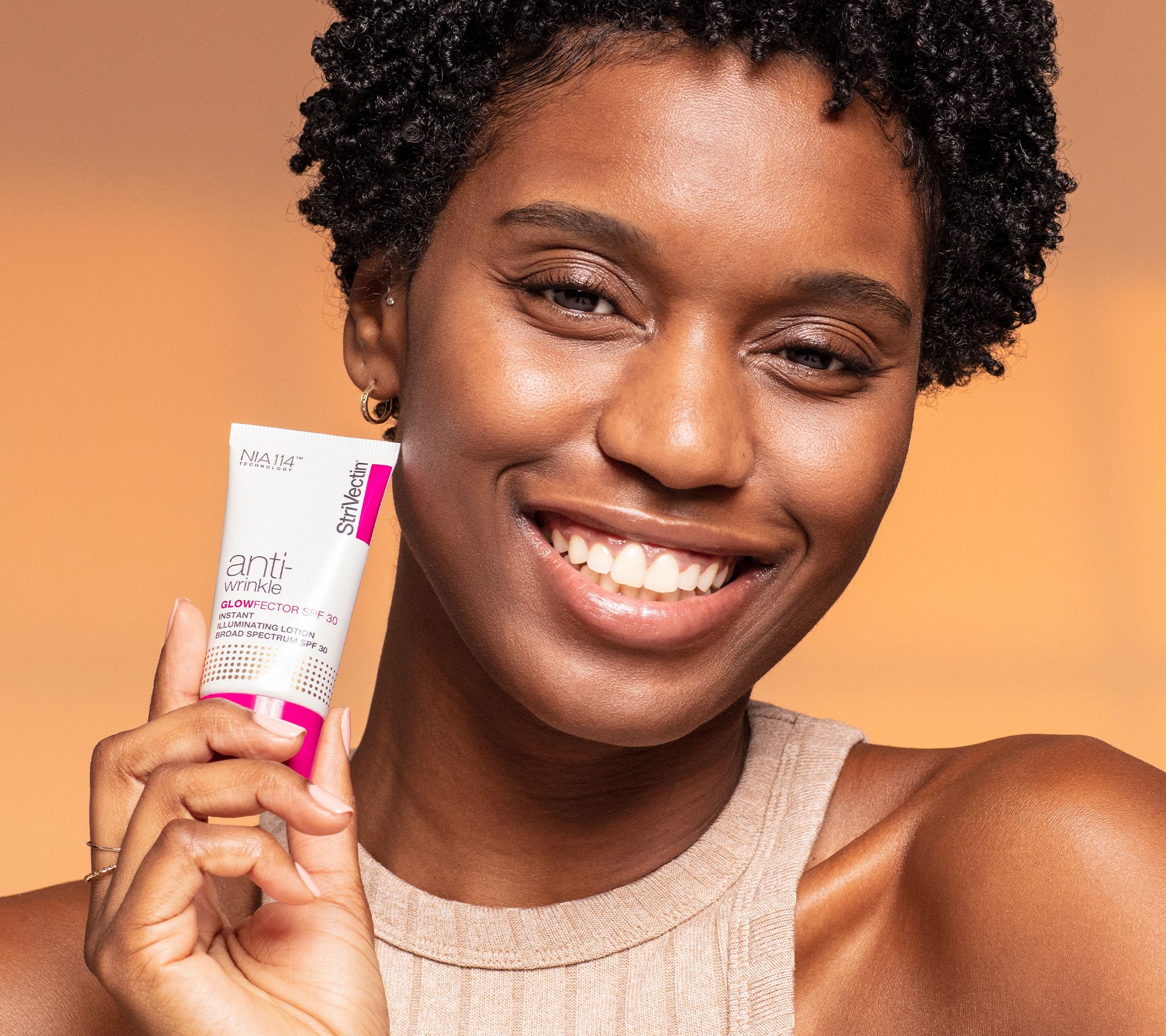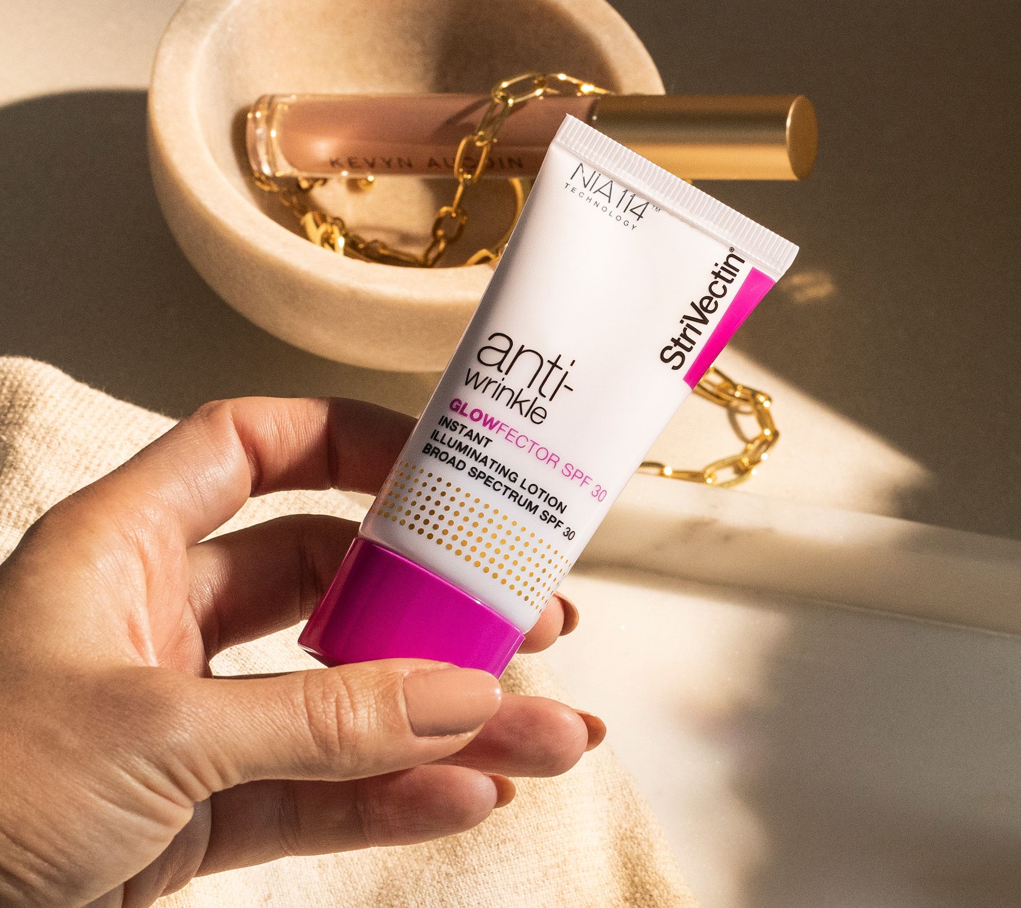 GlowFector Illuminating Lotion Broad Spectrum SPF 30 is formulated with illuminating pearl that temporarily delivers an immediate luster and glow, and licorice and marshmallow root extract that temporarily helps to improve the look of radiance. It also contains antioxidant French rice germ extract that may help fight against free radical aggressors. Plus, StriVectin formulas feature NIA-114, an optimized form of niacin (vitamin B3) that helps improve skin’s moisture barrier by helping prevent against trans-epidermal water loss -- for a total the more you glow moment! From StriVectin.