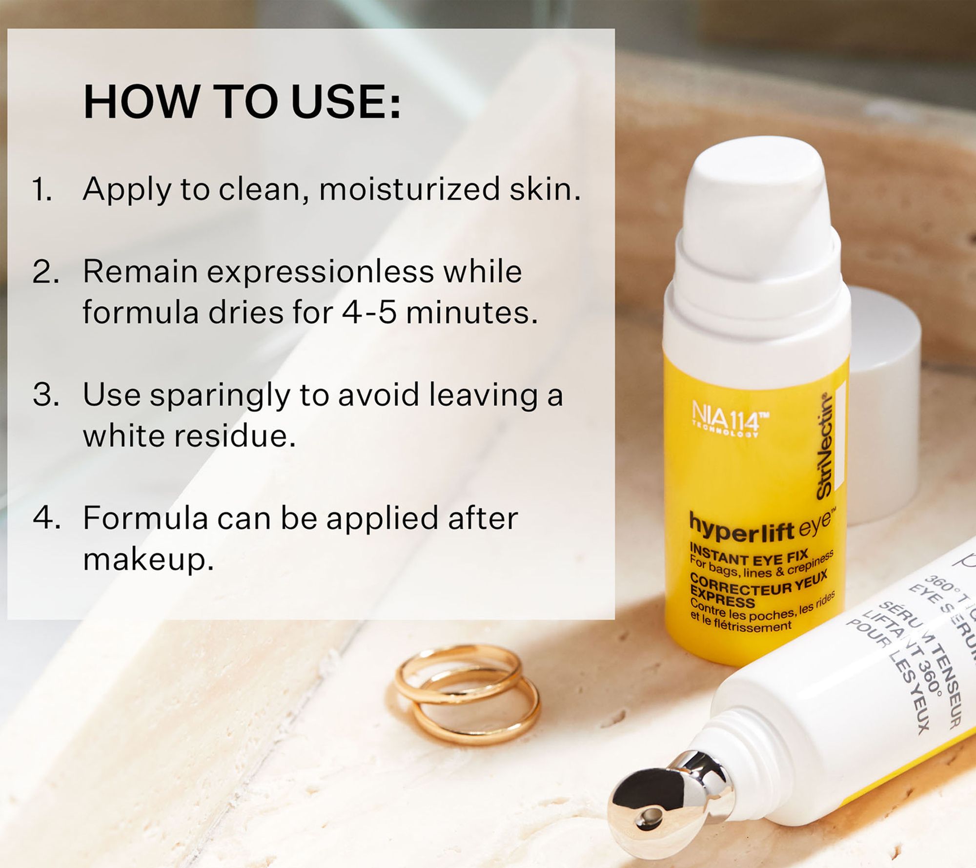 Apply StriVectin Hyperlift Eye Instant Eye Fix to the undereye area to immediately reduce the look of bags, puffiness, crepey texture, and wrinkles. Formulated with patented NIA-114 and a mineral tightening complex, this leave-on formula blends into skin.