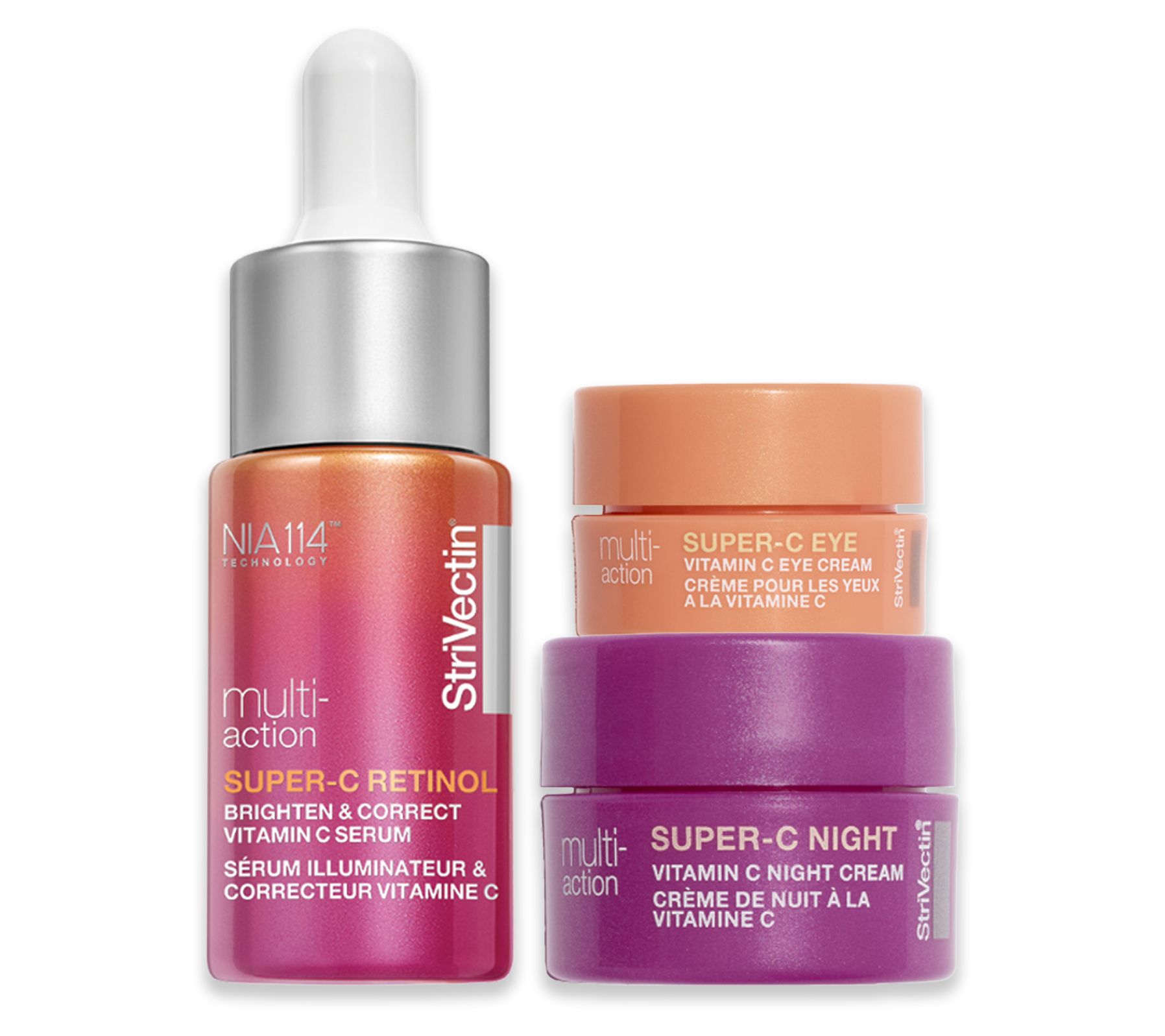 Pick up this StriVectin Brighten & Correct three-piece set, featuring Super-C, a breakthrough combination of vitamin C and retinol. Super-C Retinol Brighten & Correct Vitamin C Serum is a lightweight serum for visibly renewed, glowing skin. Super-C Eye Vitamin C Eye Cream visibly brightens and rejuvenates the eye area. Super-C Night Vitamin C Night Cream includes vitamin C (ethyl ascorbic acid) combined with ferulic acid and kojic acid to reboot your skin overnight.