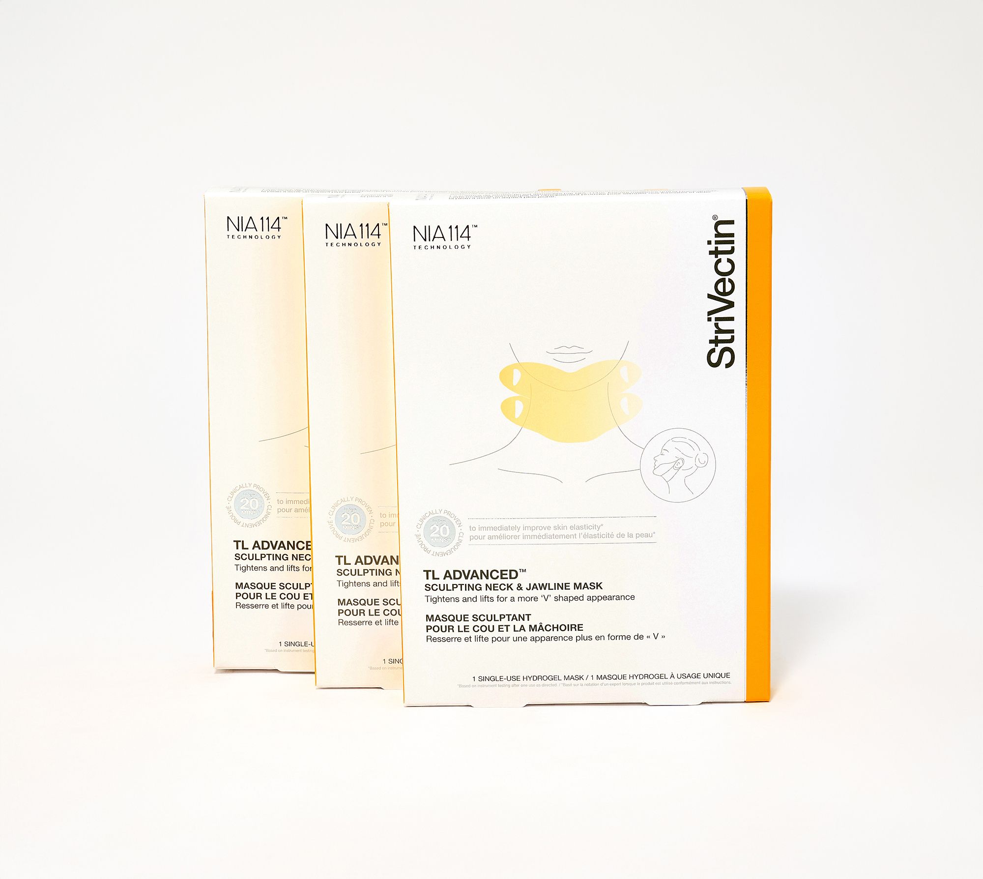 StriVectin TL Advanced Neckline and Jawline Mask features slip-resistant fabric backed hydrogel material that provides enhanced delivery of moisture and ingredients to skin with a temporary topical cool sensation. It contains Strivectin's proprietary Alpha-3 Peptide, caffeine, and NIA-114.