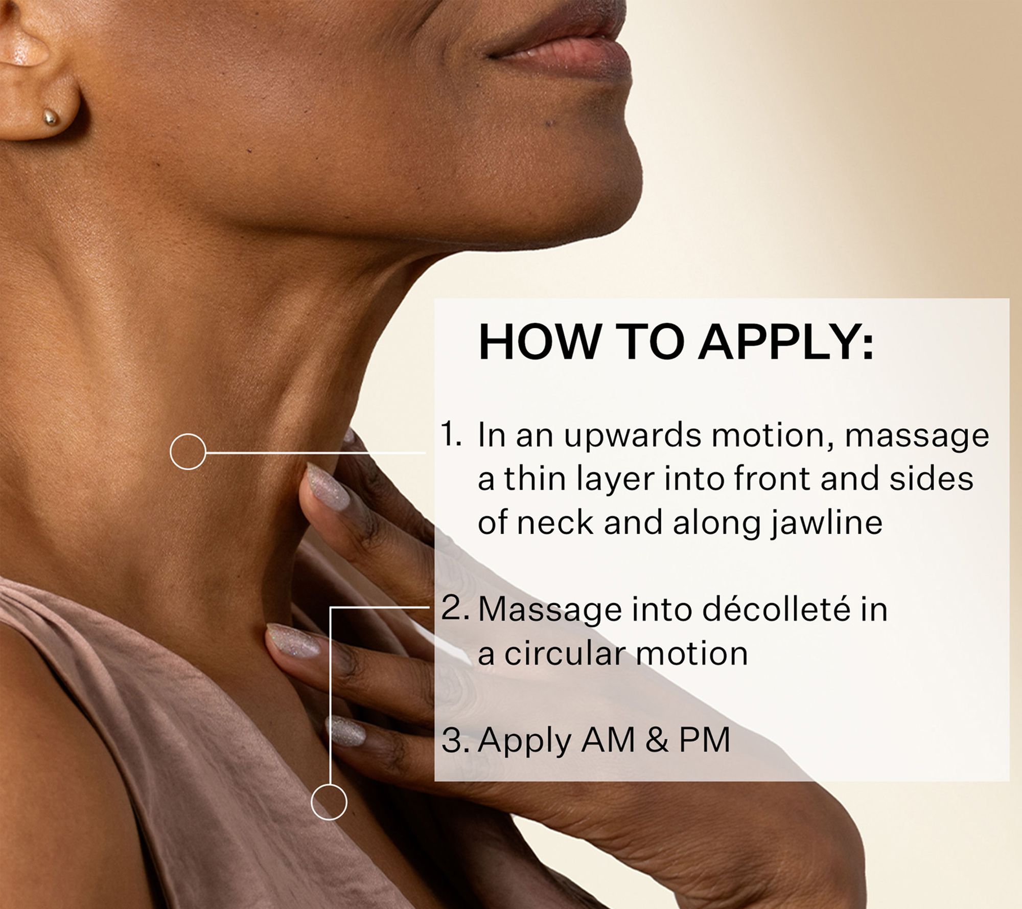 How do I use it: Apply a thin layer to clean skin on neck, jawline, and decollete in the morning and evening. Gently massage into skin with an upward motion.
