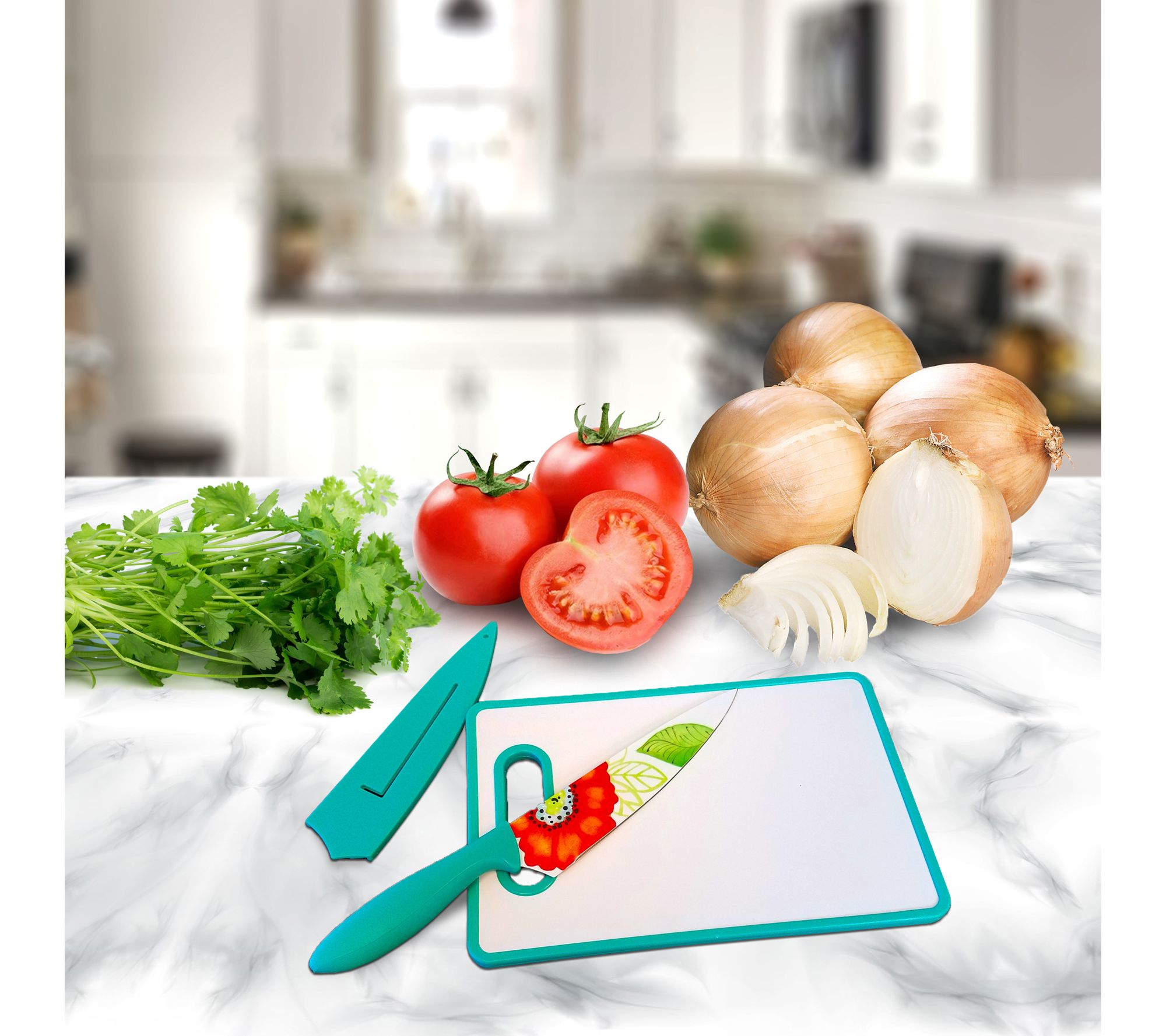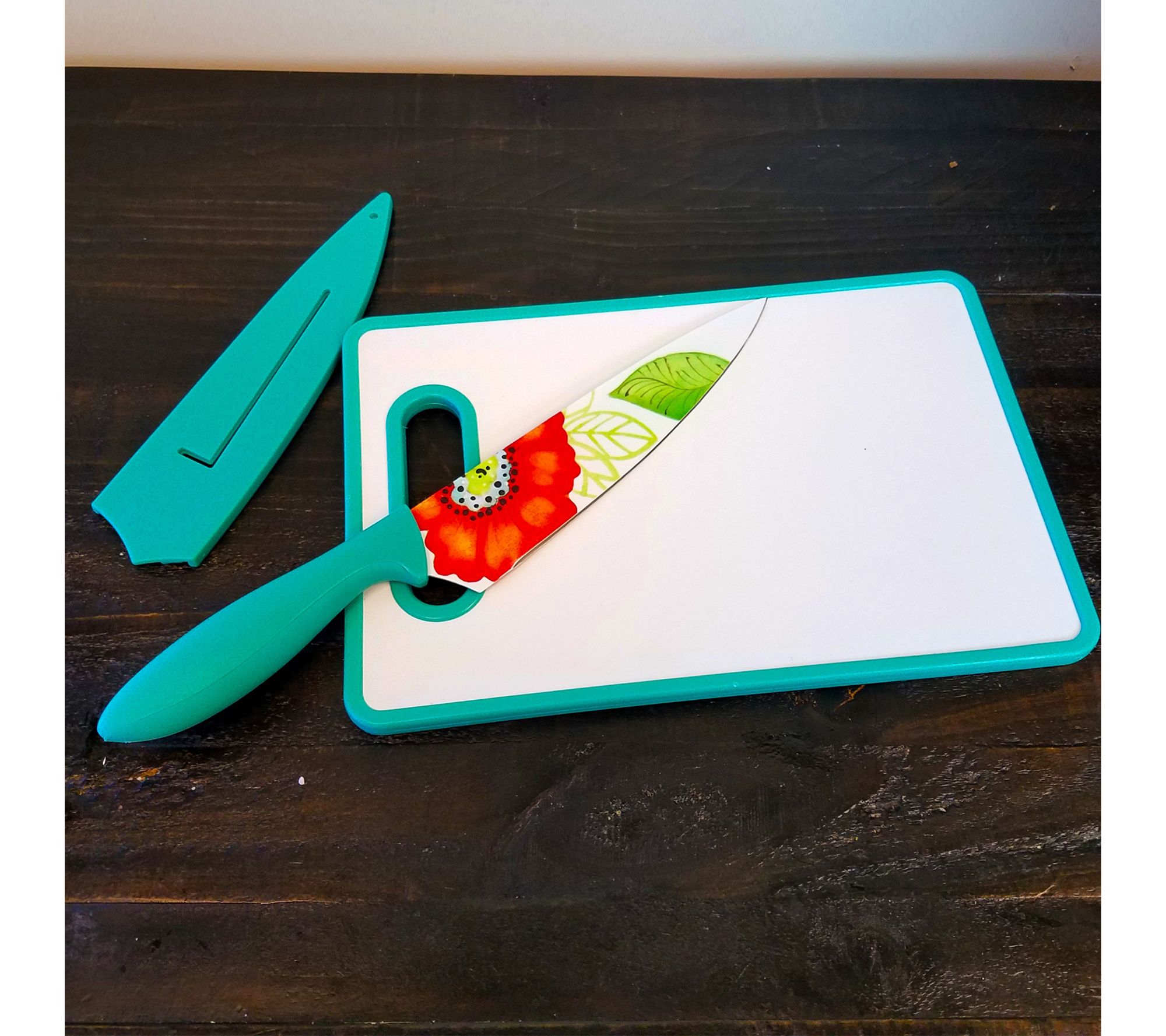Brighten up everyday meal prep with this chef knife set, featuring a bold Turquoise floral pattern that adds a cheerful touch to your kitchen. The sharp stainless steel blade and ergonomically shaped handle make slicing, dicing, and chopping vegetables smooth and comfortable, while the matching cutting board and sheath keep your workspace organized. From Studio California.