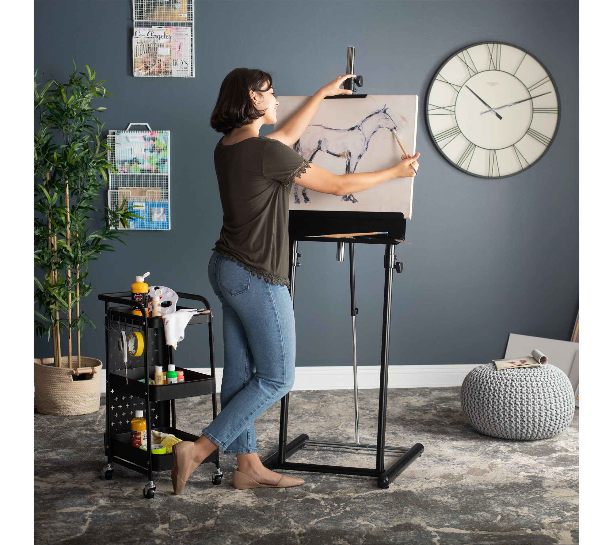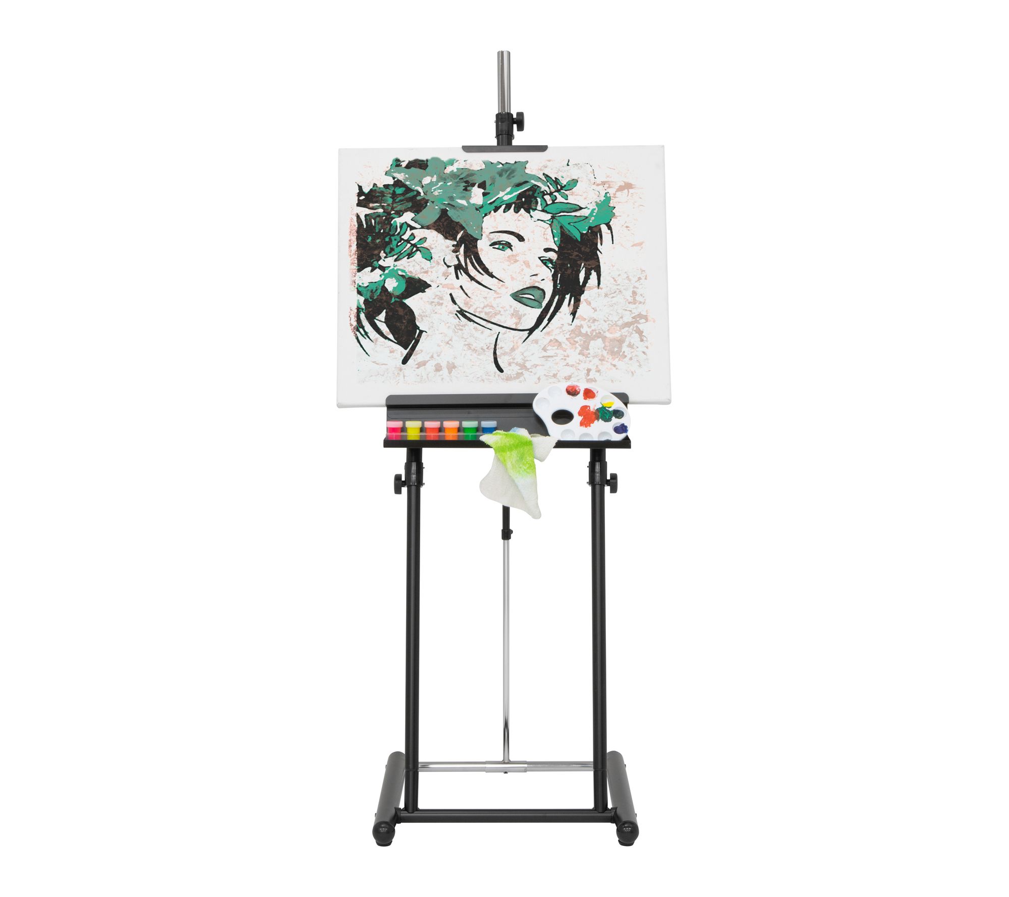 Create your studio, gallery, or workspace with this metal easel, offering flexibility for drawing, painting, or elegantly displaying artwork. Adjustable telescope tilt and shure clamps make height and angle changes effortless, while a built-in storage tray keeps tools conveniently at hand. The extra-tall design is ideal for showcasing large canvases. From Studio Designs.