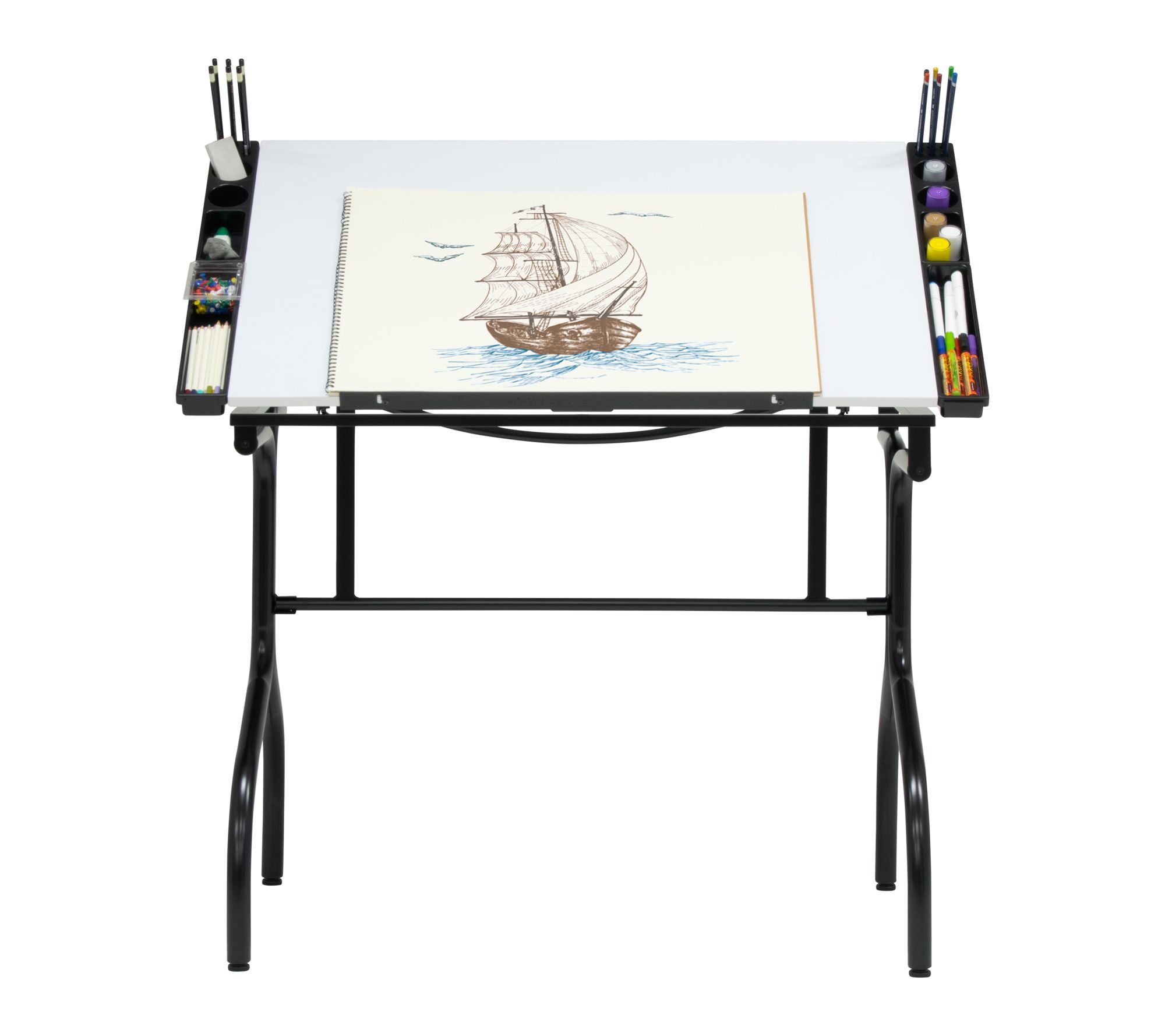 • Features adjustable table top with 6 angles (0 to 35 degrees); folds flat for storage; heavy-gauge steel frame; four removable side trays; 24" sliding pencil ledge; floor levelers for stability