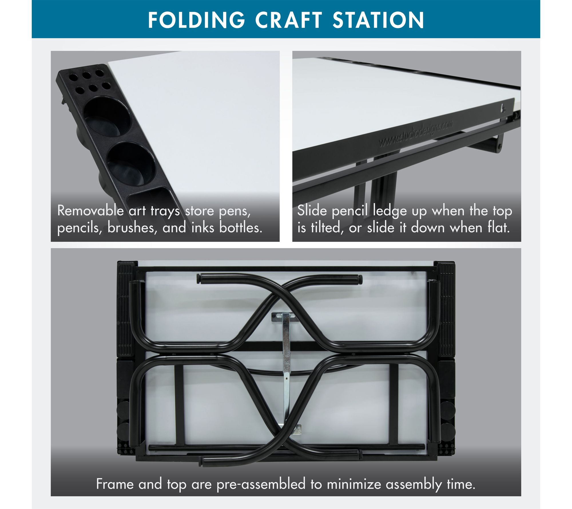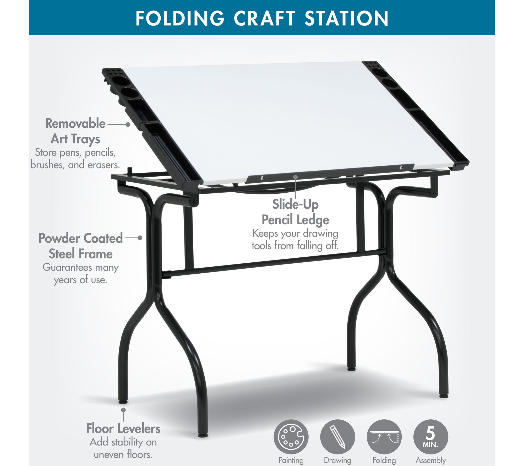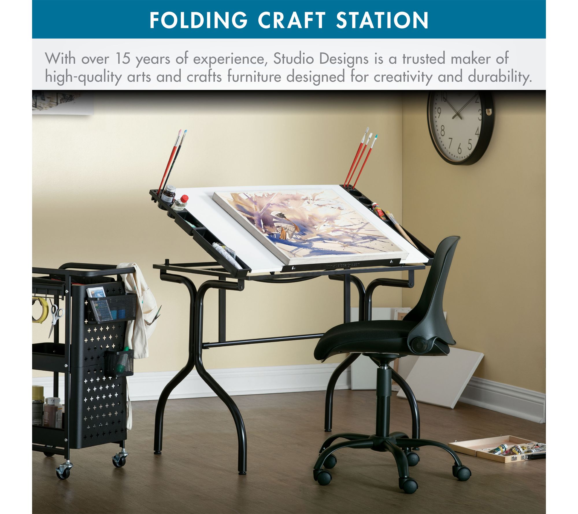 Set yourself up for a productive day with this versatile folding craft table, thoughtfully designed for creative projects and flexible enough to fit any space -- simply unfold and get to work, then easily tuck it away when you're done. Adjust the top to your preferred angle, keep supplies organized in removable trays, and enjoy a sturdy, sleek workspace wherever inspiration strikes. From Studio Designs.