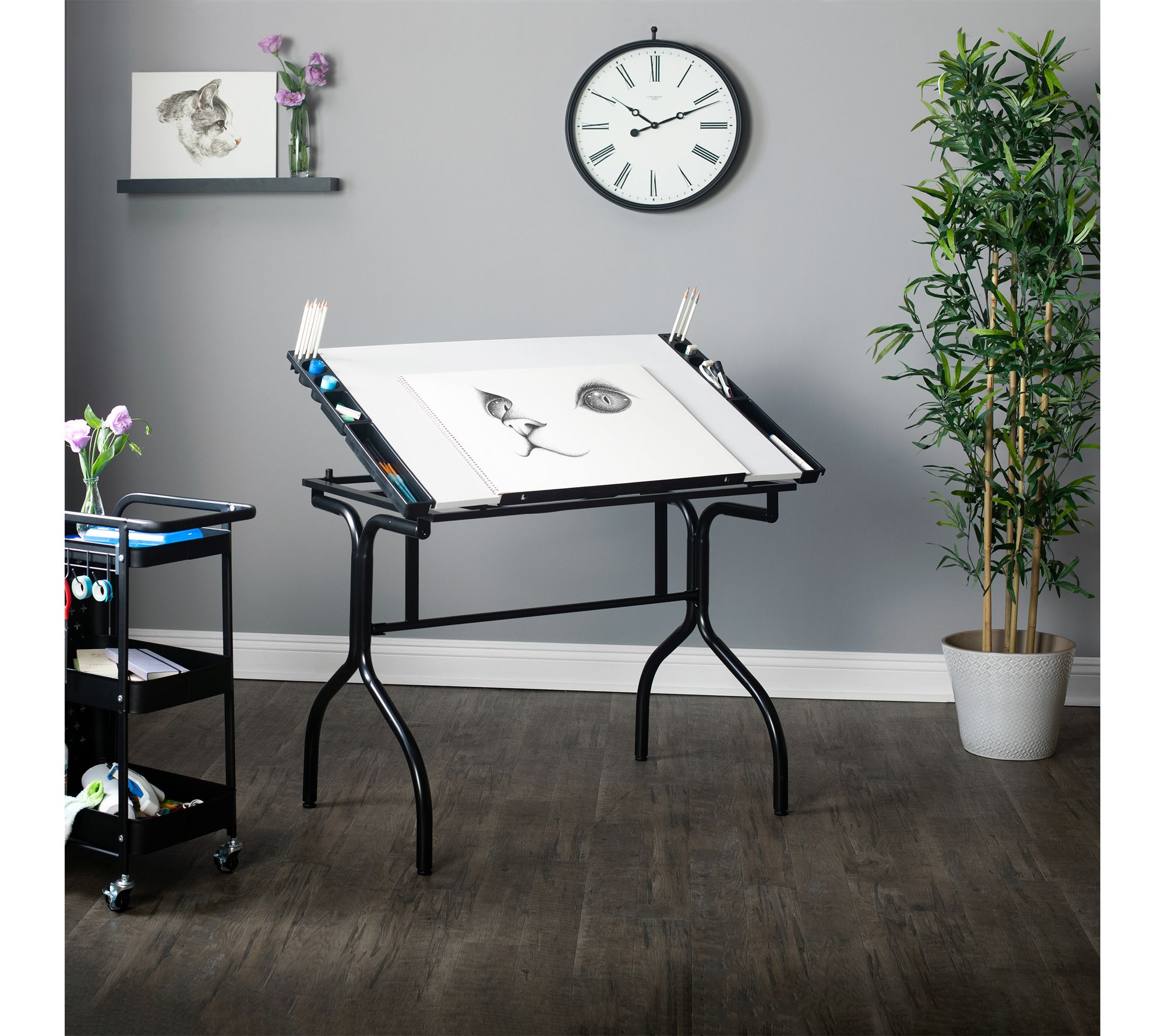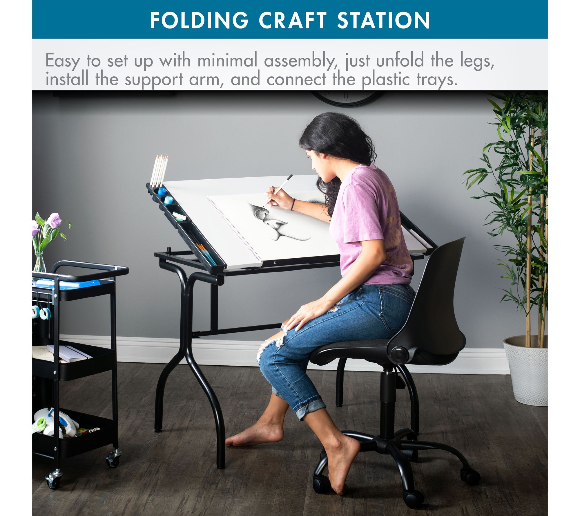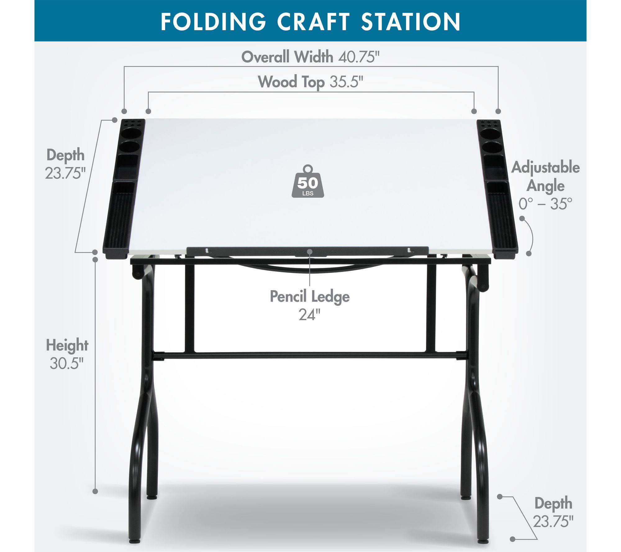 Set yourself up for a productive day with this versatile folding craft table, thoughtfully designed for creative projects and flexible enough to fit any space -- simply unfold and get to work, then easily tuck it away when you're done. Adjust the top to your preferred angle, keep supplies organized in removable trays, and enjoy a sturdy, sleek workspace wherever inspiration strikes. From Studio Designs.