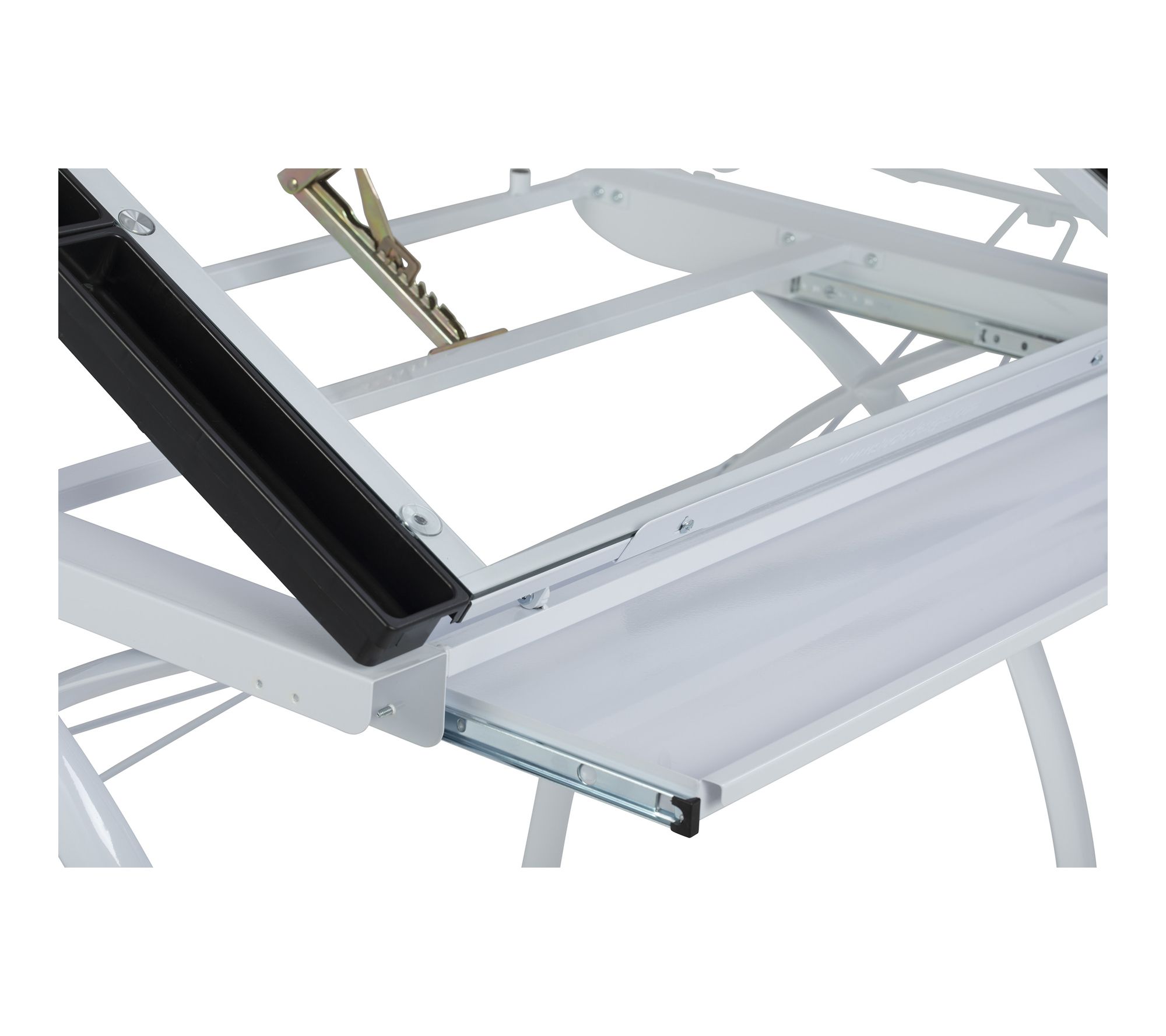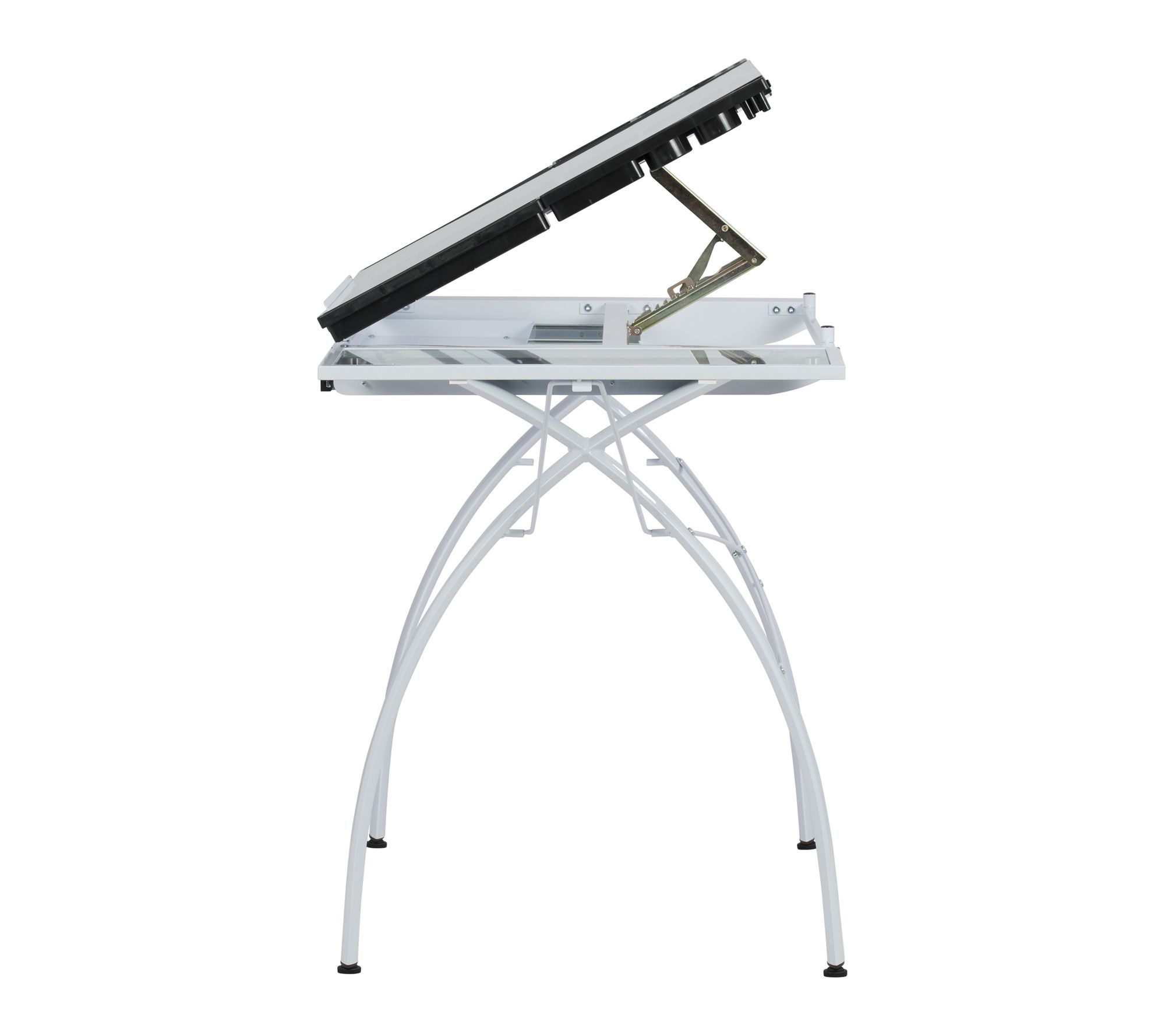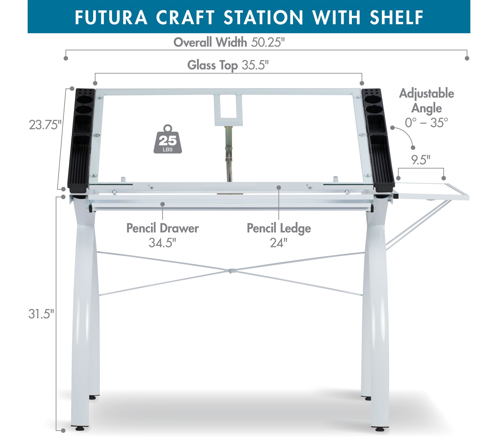 • Main work surface tilts up to 35 degrees; features a 35.5"W x 23.75"D tempered glass top, large pencil drawer, and 24" slide-up pencil ledge