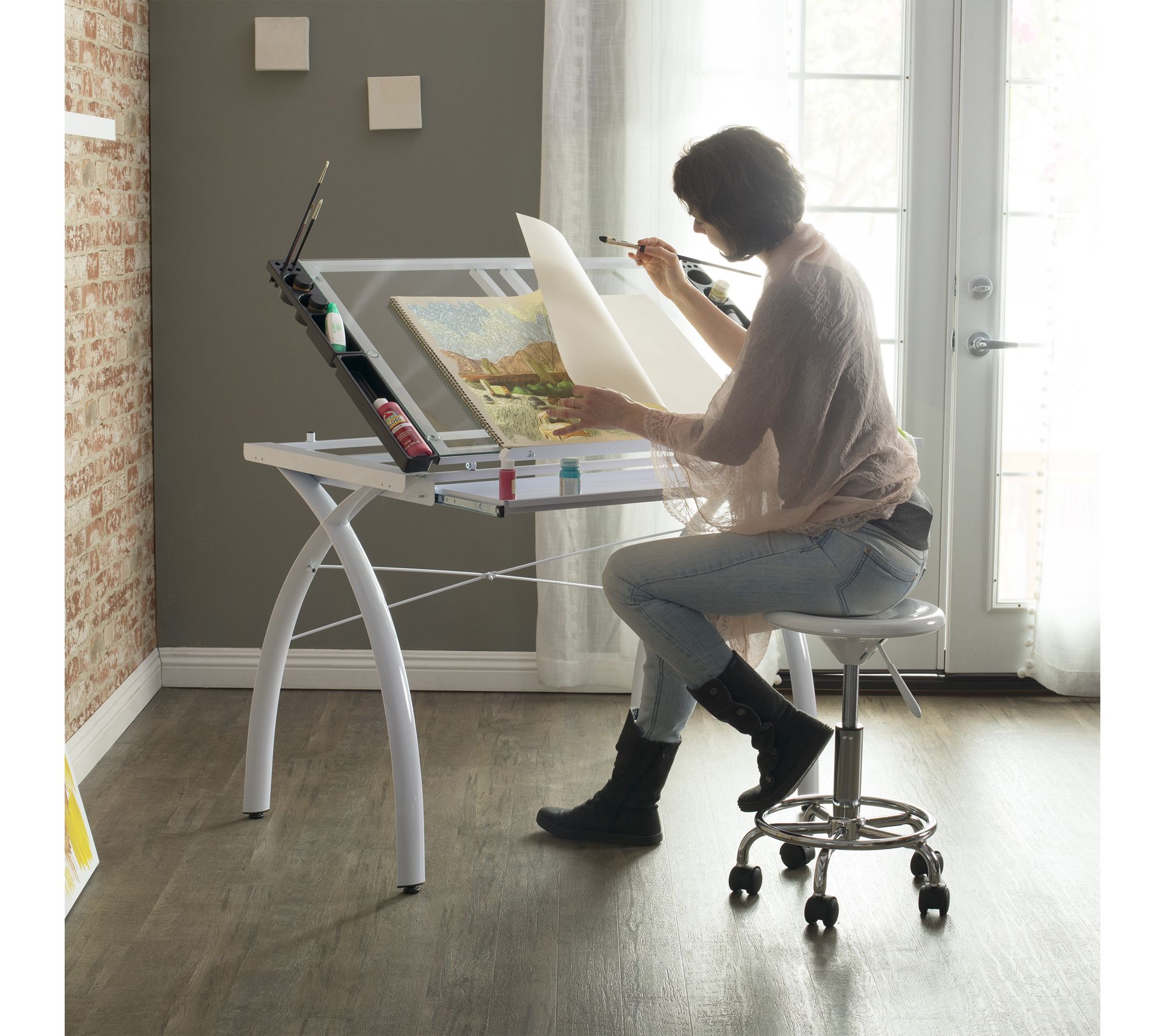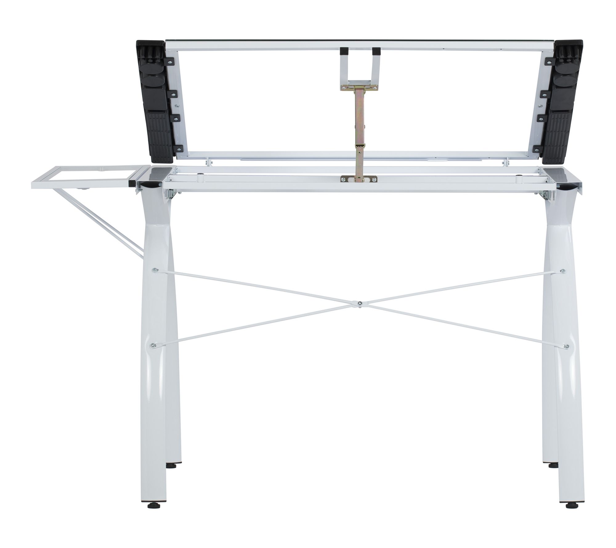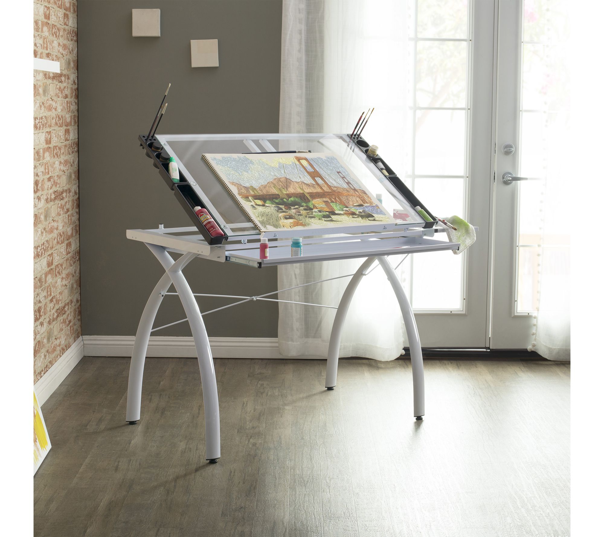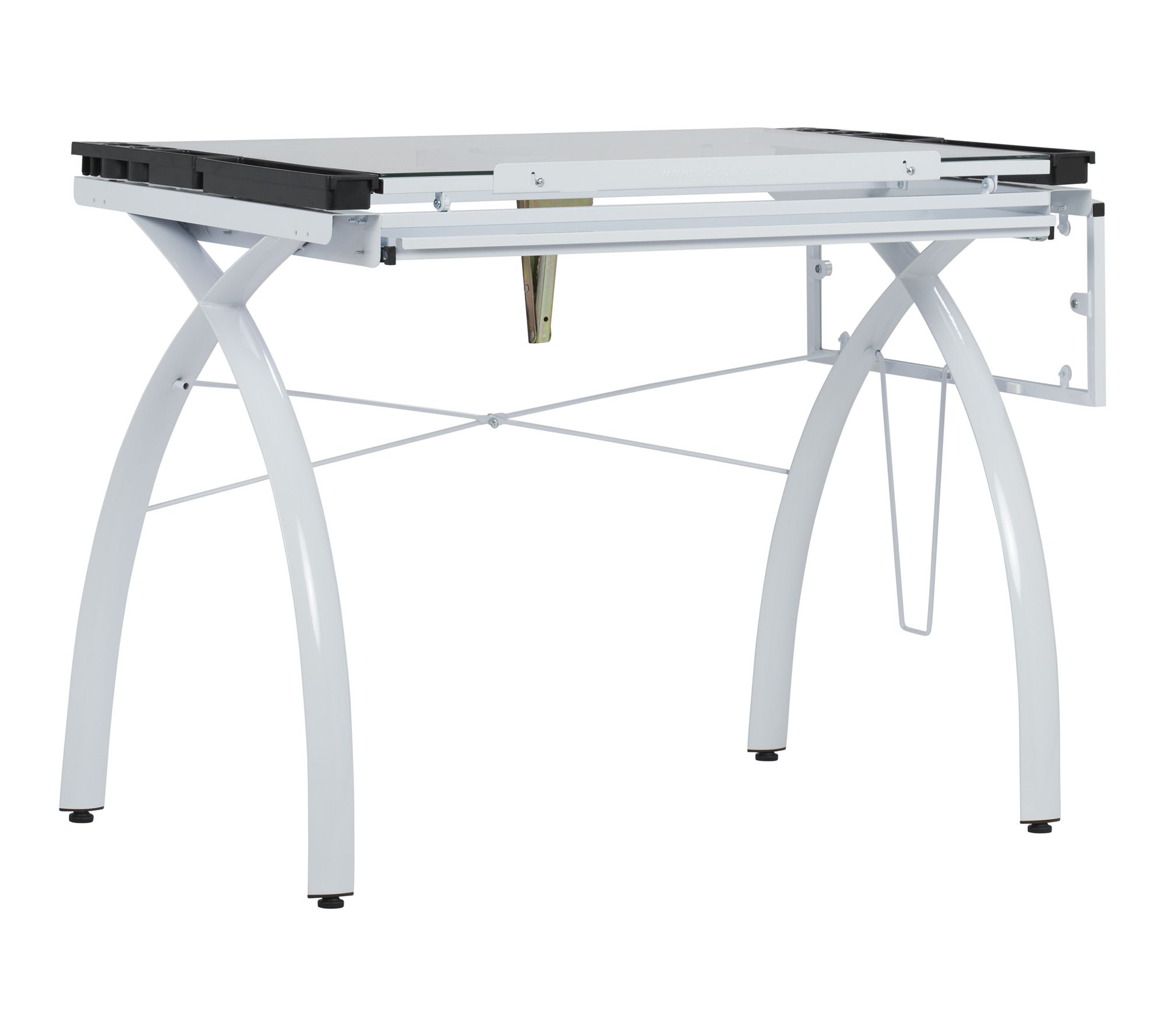 Bring a touch of inspiration and functionality to your creative space with this contemporary craft station desk. Whether you're sketching designs, assembling crafts, or planning your next DIY project, the smooth tempered glass work surface and adjustable top invite productivity, while an included folding side shelf and built-in storage options keep essentials within arm's reach. From Studio Designs.