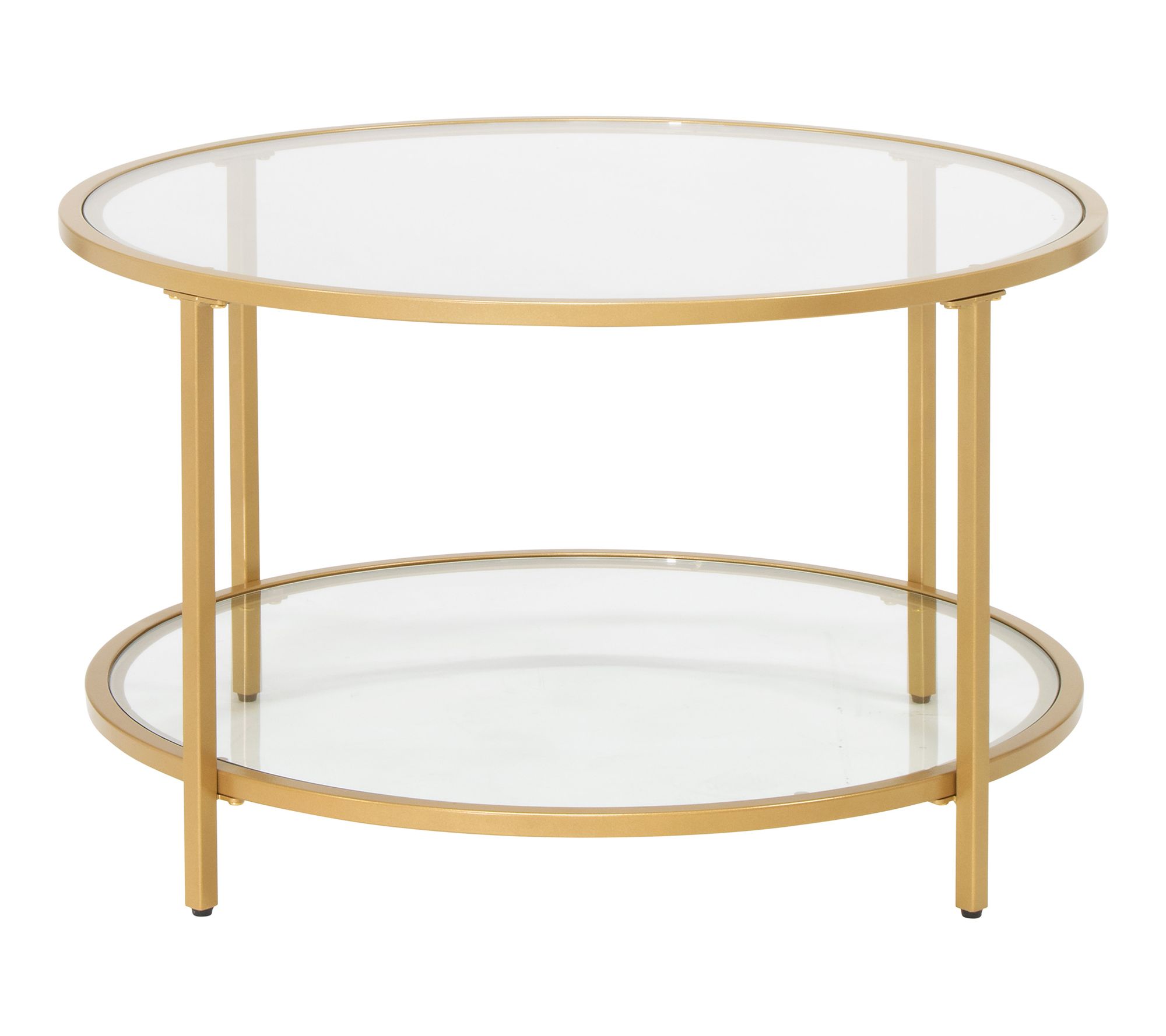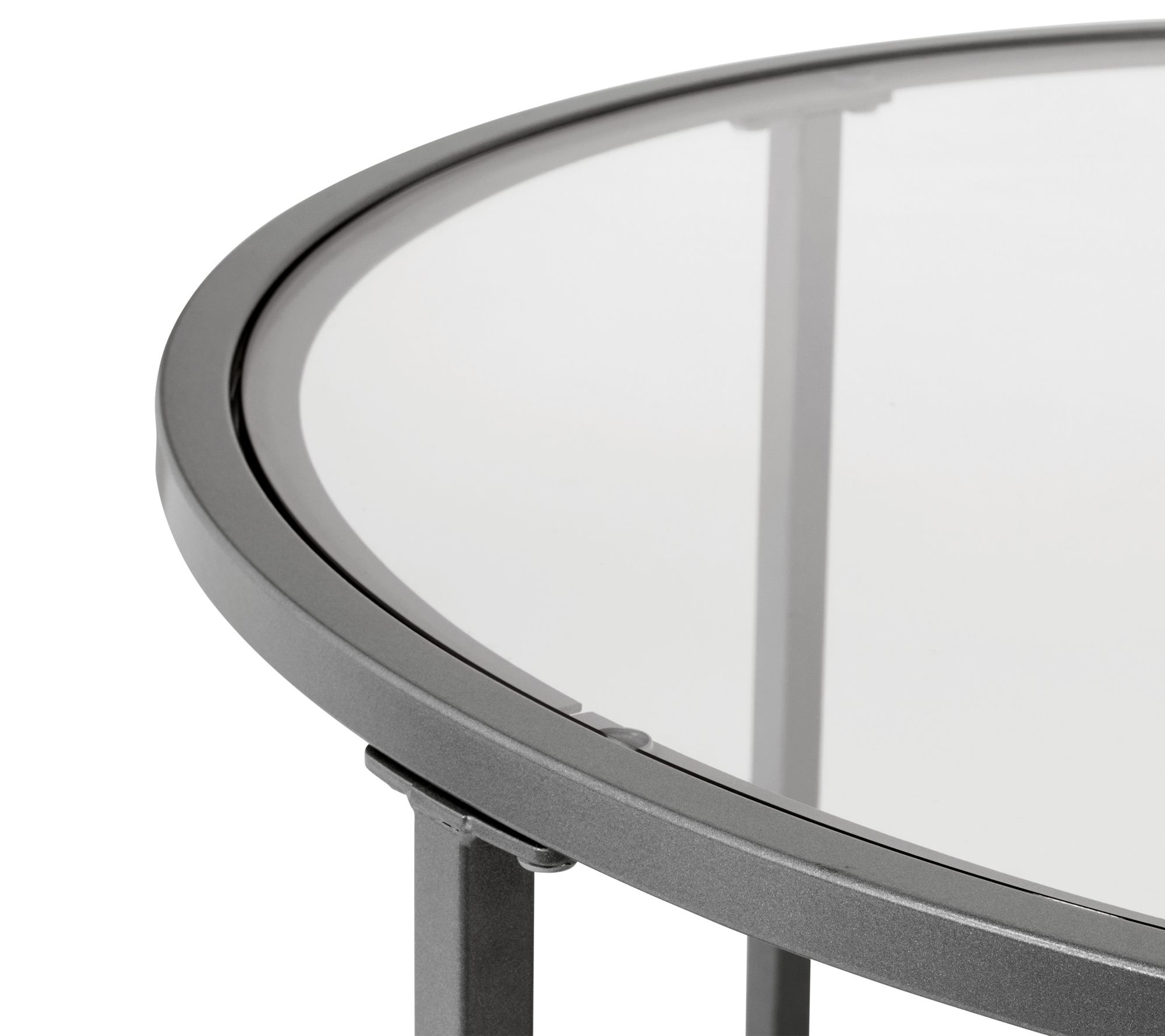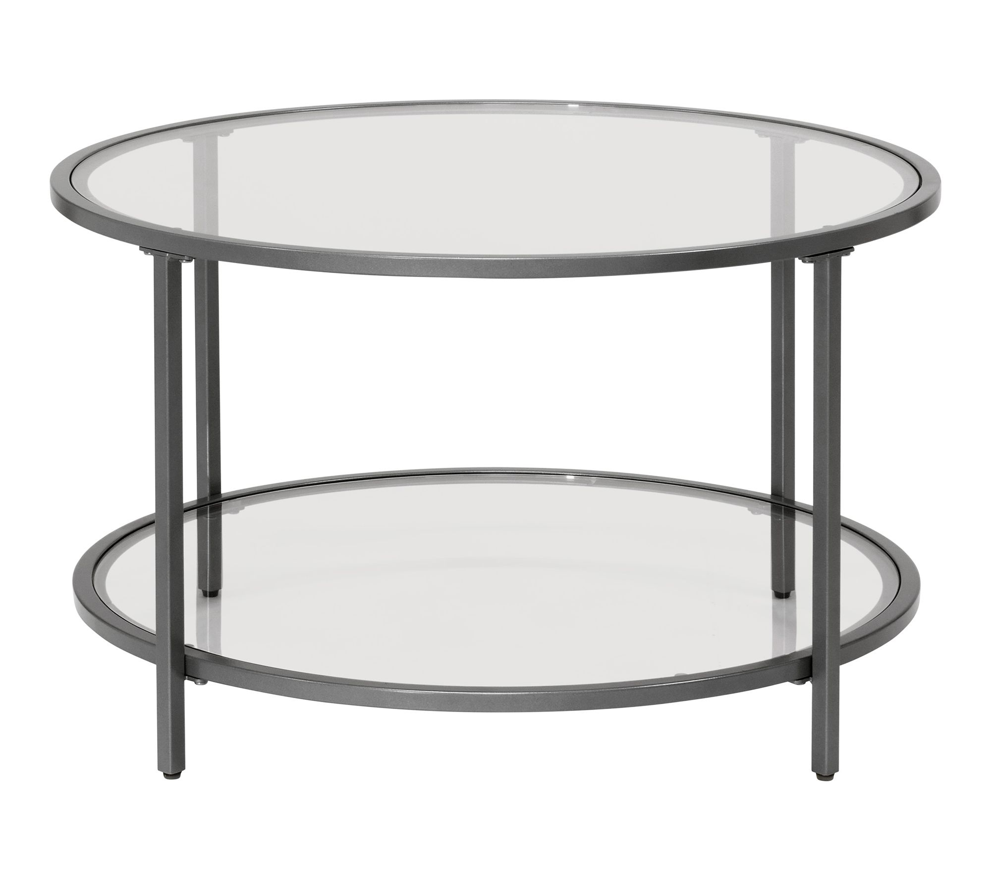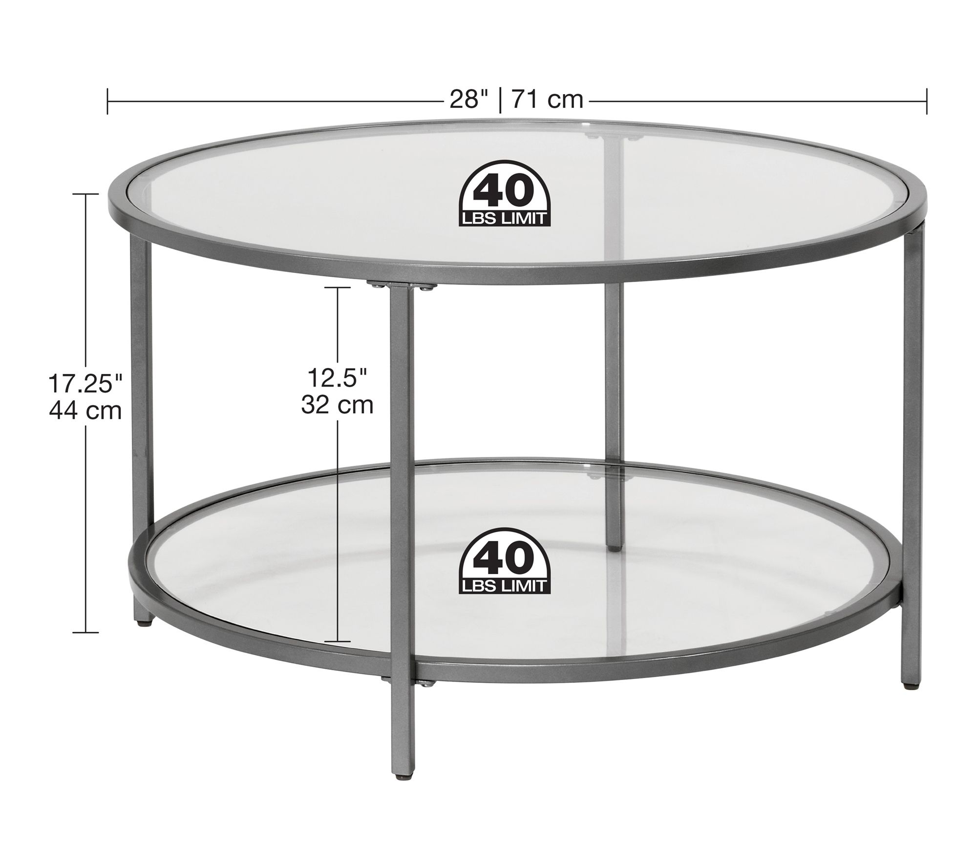 Bring refined modern style and versatility into your living space with this round coffee table. Sleek tempered glass and a sturdy pewter-finished metal frame create a contemporary centerpiece, while two shelves provide room for your favorite books, decorative trays, or evening treats. The compact design fits seamlessly in apartments, sitting rooms, or cozy corners. From Studio Designs Home.